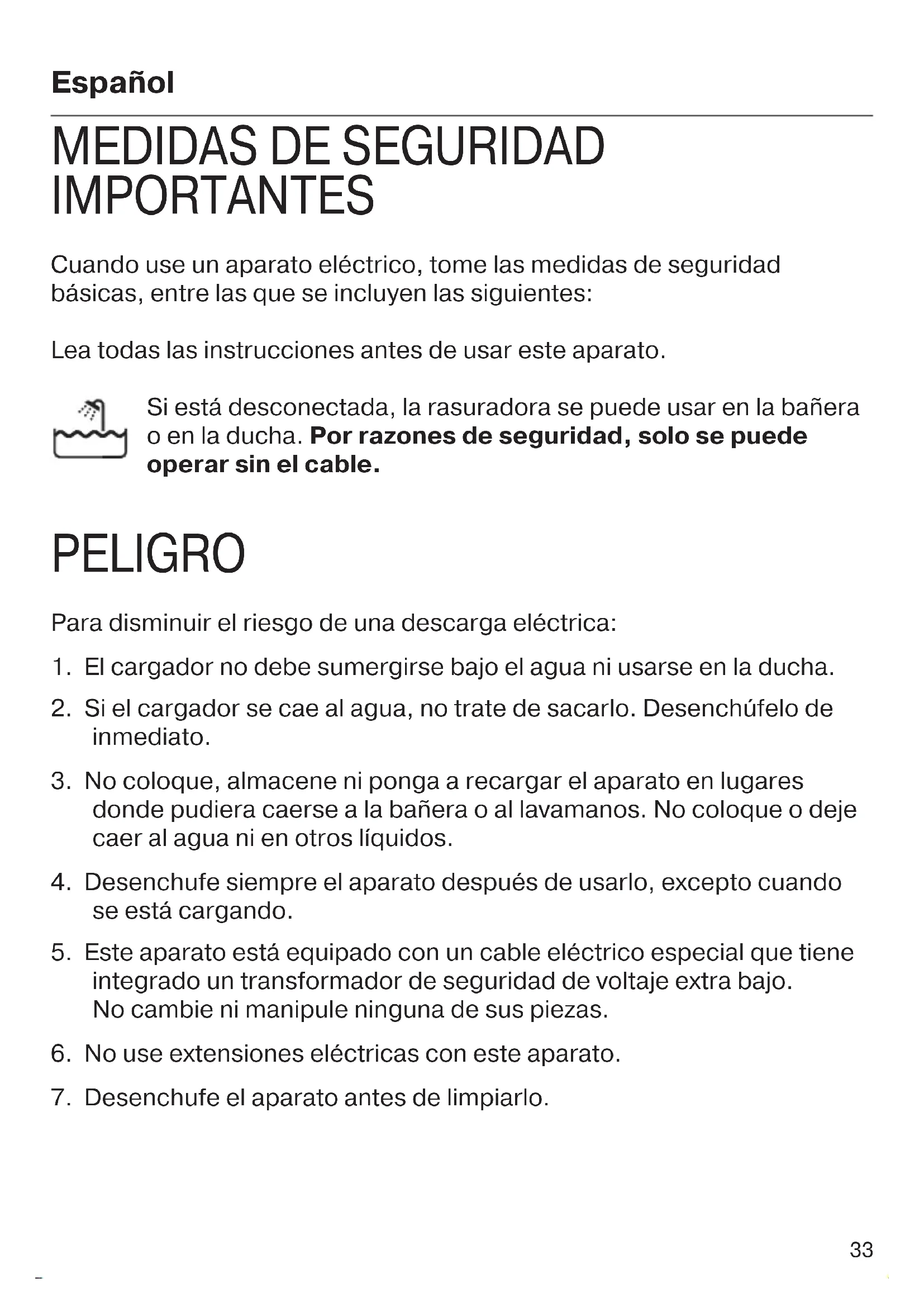 IMPORTANTES Cuando use un aparato eléctrico, tome las medidas de seguridad básicas, entre las que se incluyen las siguientes: Lea todas las instrucciones antes de usar este aparato. Si está desconectada, la rasuradora se puede usar en la bañera o en la ducha. Por razones de seguridad, solo se puede operar sin el cable. PELIGRO Para disminuir el riesgo de una descarga eléctrica: