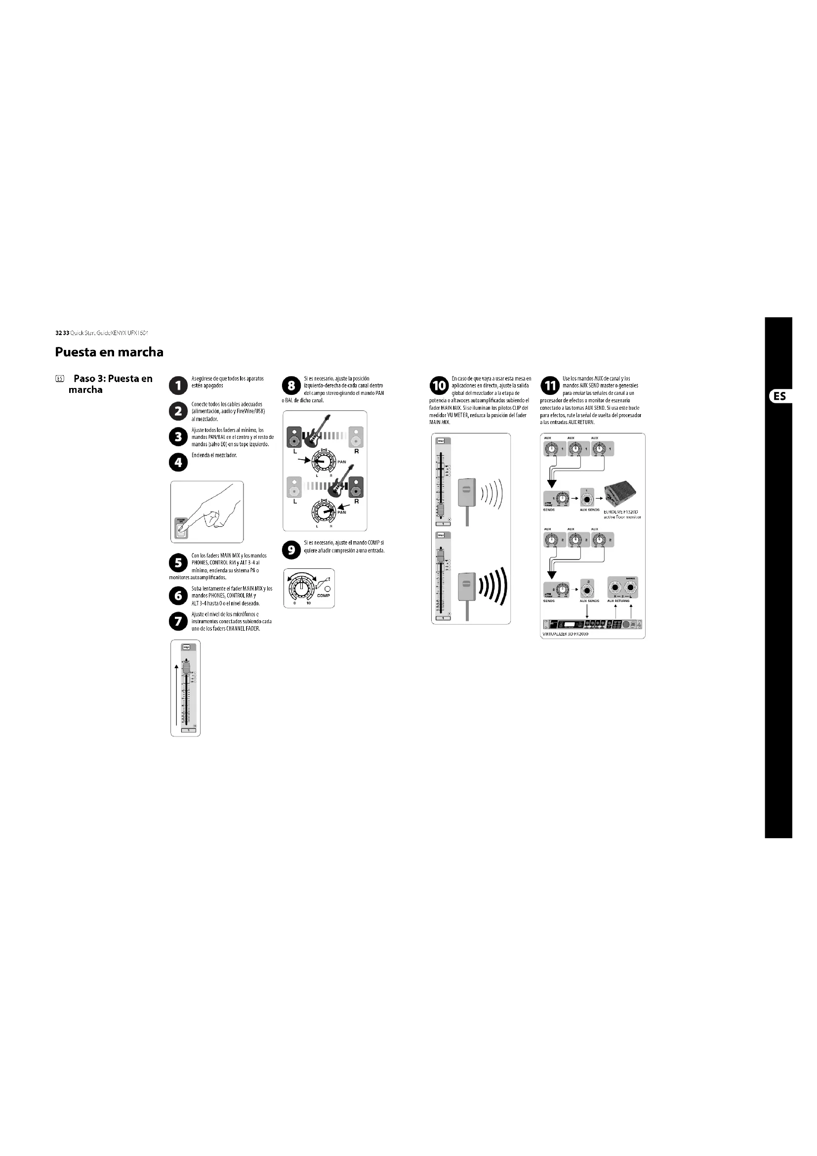 O (too slow). SLO The connected USB drive has been speci ed as too slow. No recording will be possible. Although USB sticks and 2.5" USB-powered external drives could work, the use of powered hard drives for direct recording with the internal USB recorder is recommended.32 33 Quick Start GuideXENYX UFX1604 (ES) Paso 3: Puesta en marcha Puesta en marcha Asegúrese de que todos los aparatos estén apagados Conecte todos los cables adecuados (alimentación, audio y FireWire/USB) al mezclador. Ajuste todos los faders al mínimo, los mandos PAN/BAL en el centro y el resto de mandos (salvo EQ) en su tope izquierdo. Encienda el mezclador. Con los faders MAIN MIX y los mandos PHONES, CONTROL RM y ALT 3-4 al mínimo, encienda su sistema PA o monitores autoampli cados. Suba lentamente el fader MAIN MIX y los mandos PHONES,CONTROL RM y ALT 3-4 hasta 0 o el nivel deseado. Ajuste el nivel de los micrófonos e instrumentos conectados subiendo cada uno de los faders CHANNEL FADER. Si es necesario, ajuste la posición izquierda-derecha de cada canal dentro del campo stereo girando el mando PAN o BAL de dicho canal. Si es necesario, ajuste el mando COMP si quiere añadir compresión a una entrada. En caso de que vaya a usar esta mesa en aplicaciones en directo, ajuste la salida global del mezclador a la etapa de potencia o altavoces autoampli cados subiendo el fader MAIN MIX. Si se iluminan los pilotos CLIP del medidor VU MET ER, reduzca la posición del fader MAIN MIX. Use los mandos AUX de canal y los mandos AUX SEND master o generales para enviar las señales de canal a un procesador de efectos o monitor de escenario conectado a las tomas AUX SEND. Si usa este bucle para efectos, rute la señal de vuelta del proc esador a las entradas AUX RETURN. EUROLIVE F1320D active oor monitorVIRTUALIZER 3D FX200034 35 Quick Start GuideXENYX UFX1604 Ajuste de la ganancia Doble procesador multiefectos (ES) Paso 5: Doble procesador multiefectos Pulse el botón SOLO del canal 1. Pulse el botón MODE que está debajo del medidor VUMETER en la sección principal para hacer que el medidor funcione en el modo PFL (escucha pre-fader). Cante, hable o toque a un nivel de reproducción normal a través del micrófono o instrumento conectado al canal 1. Mientras canta o toca, gire el mando GAIN del canal 1. El medidor VU METER le mostrará el nivel de la señal. Ajuste el mando GAIN de forma que los picos de mayor volumen le muestren una lectura de 0 en el medidor VU METER. Pulse de nuevo el bot ón SOLO del canal 1. Repita los pasos 1-3 en el resto de canales que vaya a usar. Su mezclador dispone de dos procesadores de efectos internos. Siga estos pasos si quiere añadir uno o dos efectos a uno o más canales. Gire el mando FX A o FX B hasta la mitad en cada uno de los canales en los que quiera añadir un efecto. Lleve los mandos FX SEND y FX RETURN hasta la posición “0”. Podrá ajustar más su posición después. Asegúrese de que el botón FX ON esté pulsado. Desplácese por los distintos efectos girando el mando FX A (lo mismo para FX B). Ajuste la intensidad del efecto girando el mando EDIT. Si usa los presets 1-8, 13-14 ó 16, pulse el botón TAP/SELECT para cambiar entre dos valores distintos (piloto apagado/ encendido) para el segundo parámetro. Para ajustar el tiempo de retardo de los presets 9 y 15, pulse el botón TAP/SELECT varias veces de form a rítmica con el tempo de la música. De igual forma, pulse el botón TAP/SELECT varias veces para ajustar la velocidad de modulación de los presets 10-12. El piloto del botón comenzará a parpadear al ritmo del tempo correspondiente. Reajuste los mandos FX de cada canal para asegurarse de que es añadida la cantidad adecuada de FX A oFX B. (ES) Paso 4: Ajuste de la ganancia36 37 Quick Start GuideXENYX UFX1604 Grabación FireWire y USB Grabación a dispositivo USB en el modo STAND-ALONE (ES) Paso 6: Grabación FireWire y USB (ES) Paso 7: Grabación a dispositivo USB en el modo STAND-ALONE Su mezclador está equipado con convertidores AD/DA y conexiones FireWire y USB para el envío de la señal audio a y desde su ordenador. Asegúrese de que los drivers para el UFX1604 estén cargados en su ordenador Windows (esto no es necesario en ordenadores Mac OS X). Conecte el mezclador al ordenador vía FireWire o USB. Asegúrese de ajustar correctamente el interruptor de tres posiciones del panel trasero del mezclador. Elija las entradas y salidas del UFX1604 que quiera usar en su software de grabación. Ajuste la frecuencia de muestreo y profundidad de bits que quiera en su software DAW (workstation de audio digital). Conecte sus micrófonos, instrumentos y fuentes de nivel de línea a las entradas de canal. Puede grabar cada canal pre o post EQ como pista mono o stereo independiente en su software de grabación. También es posible grabar los envíos AUX en los canales 13/14. La mezcla MAIN o principal ta mbién puede ser grabada pulsando el botón MAIN MIX ASSIGN TO FW 15-16. Esto enviará la mezcla principal a su DAW a través de las salidas 15/16. Arme las pistas en su software de grabación e inicie la grabación cuando esté listo. Asegúrese de que ha elegido el modo STAND ALONE en el panel trasero del mezclador (posición central). La primera vez que introduzca un dispositivo USB, el mezclador comprobará la velocidad de grabación del dispositivo para determinar la calidad audio. La respuesta aparecerá en la pantalla TRANSPORT CONTROL como “Lo” (16 bits) o “Hi” (24 bits). Si el dispositivo es demasiado lento para la grabación