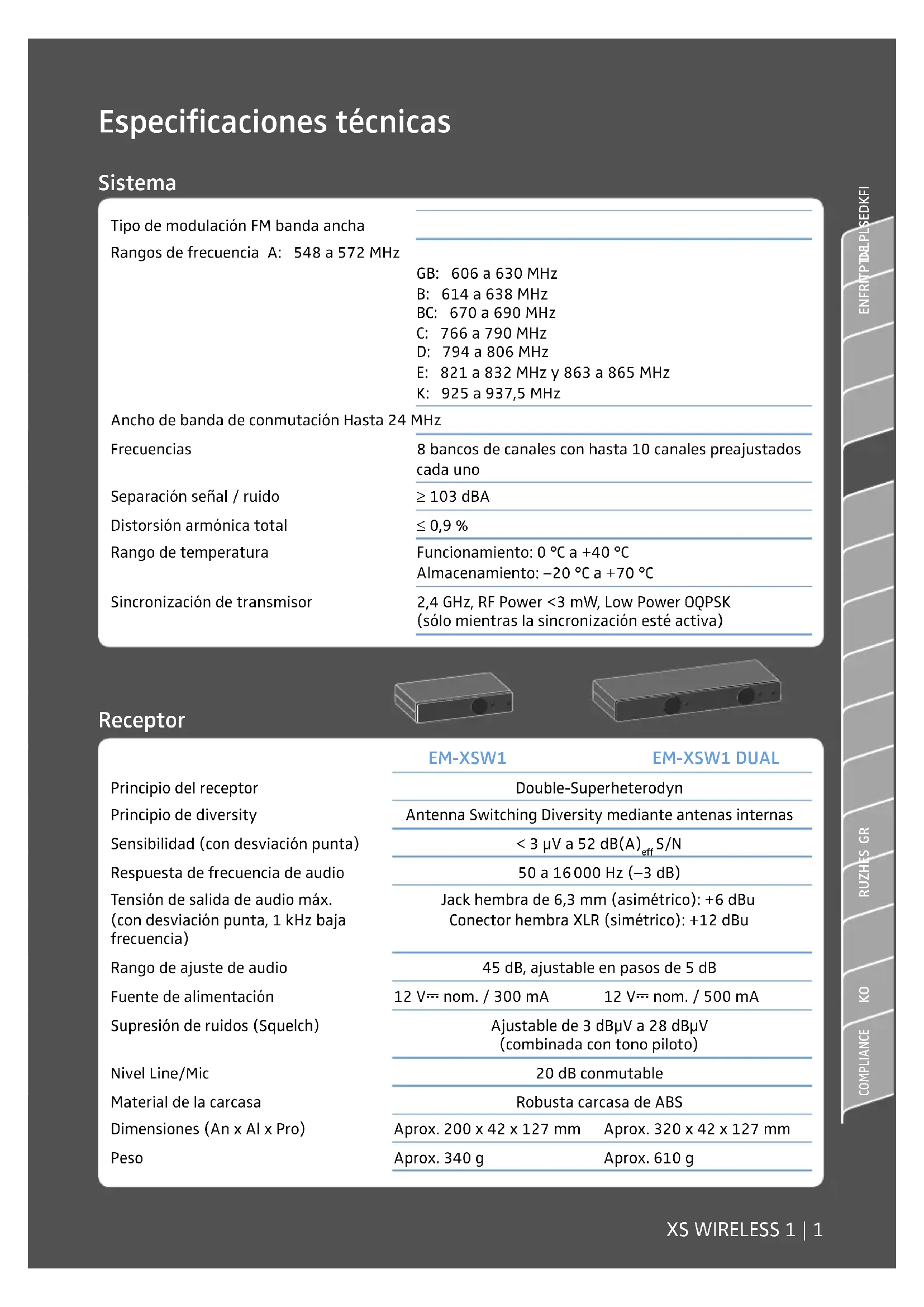 COMPLIANCE Especificaciones técnicas Tipo de modulación FM banda ancha Rangos de frecuencia A: 548 a 572 MHz GB: 606 a 630 MHz B: 614 a 638 MHz BC: 670 a 690 MHz C: 766 a 790 MHz D: 794 a 806 MHz E: 821 a 832 MHz y 863 a 865 MHz K: 925 a 937,5 MHz Ancho de banda de conmutación Hasta 24 MHz Frecuencias 8 bancos de canales con hasta 10 canales preajustados cada uno Separación señal / ruido ≥ 103 dBA Distorsión armónica total ≤ 0,9 % Rango de temperatura Funcionamiento: 0 °C a +40 °C Almacenamiento: –20 °C a +70 °C Sincronización de transmisor 2,4 GHz, RF Power <3 mW, Low Power OQPSK (sólo mientras la sincro nización esté activa) Sistema