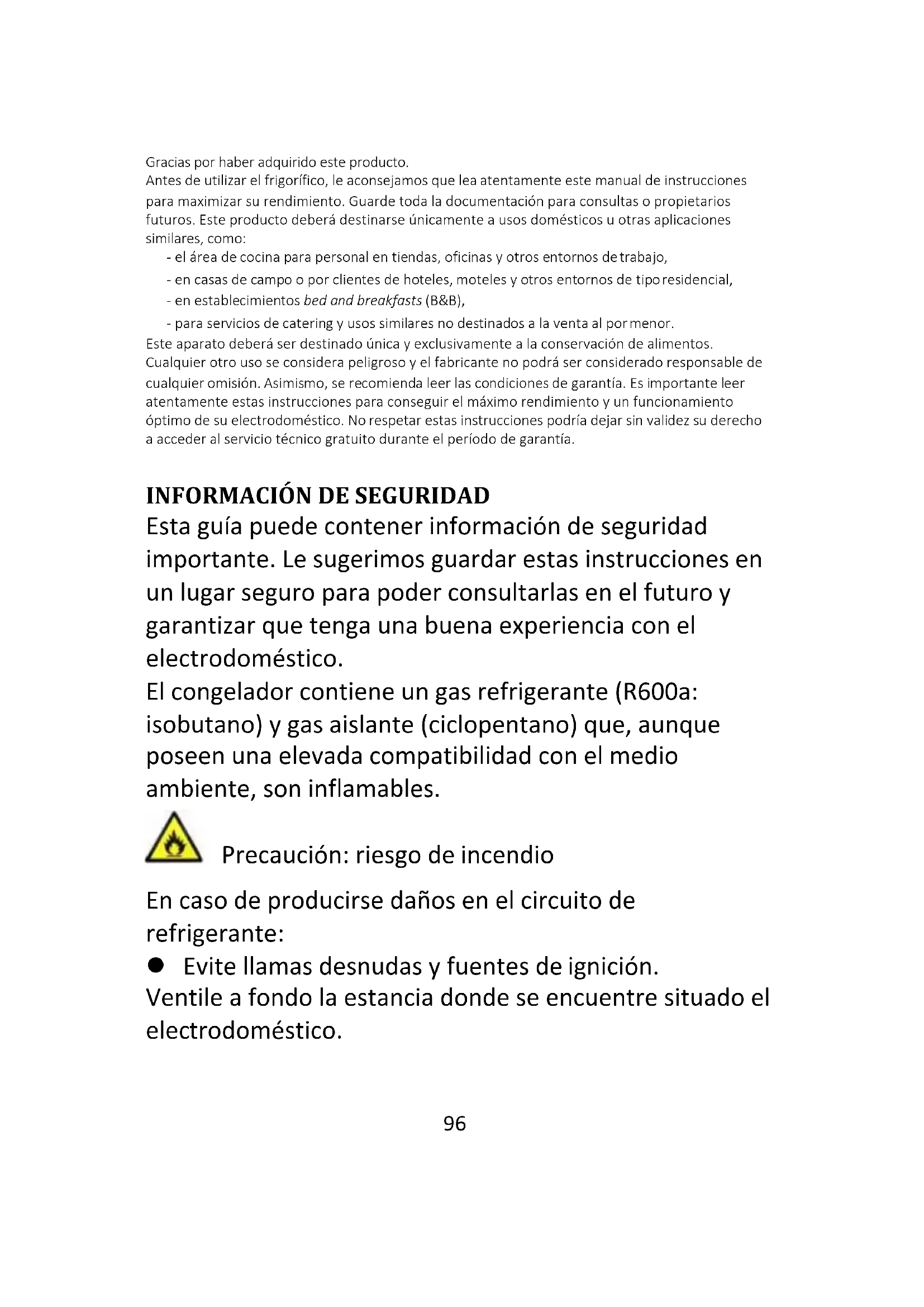 Esta guía puede contener información de seguridad importante. Le sugerimos guardar estas instrucciones en un lugar seguro para poder consultarlas en el futuro y garantizar que tenga una buena experiencia con el electrodoméstico. El congelador contiene un gas refrigerante (R600a: isobutano) y gas aislante (ciclopentano) que, aunque poseen una elevada compatibilidad con el medio ambiente, son inflamables. Precaución: riesgo de incendio En caso de producirse daños en el circuito de refrigerante: Evite llamas desnudas y fuentes de ignición. Ventile a fondo la estancia donde se encuentre situado el elec trodoméstico.97 PRECAUCIÓN