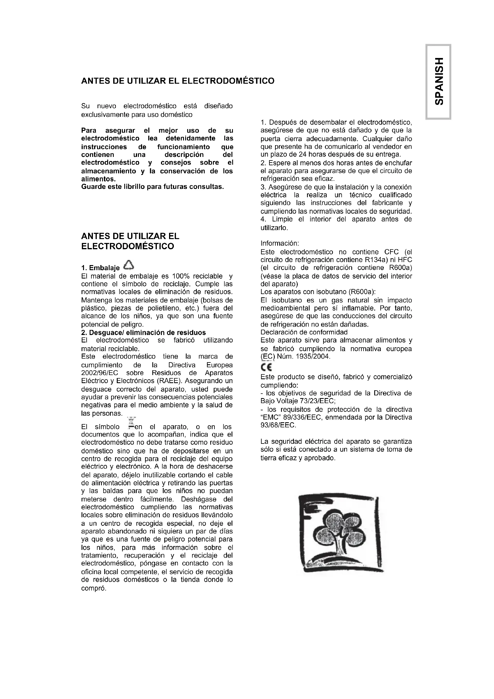 utilizarlo. Información: Este electrodoméstico no contiene CFC (el circuito de refrigeración contiene R134a) ni HFC (el circuito de refrigeración contiene R600a) (véase la placa de datos de servicio del interior del aparato) Los aparatos con isobutano (R600a): El isobutano es un gas natural sin impacto medioambiental pero sí inflamable. Por tanto, asegúrese de que las conducciones del circuito de refrigeración no están dañadas. Declaración de conformidad Este aparato sirve para almacenar alimentos y se fabricó cumpliendo la normativa europea (EC) Núm. 1935/2004. Este producto se diseñó, fabricó y comercializó cumpliendo: - los objetivos de seguridad de la Directiva de Bajo Voltaje 73/23/EEC; - los requisitos de protección de la directiva “EMC” 89/336/EEC, enmendada por la Directiva 93/68/EEC. La seguridad eléctrica del aparato se garantiza sólo si está conectado a un sistema de toma de tierra eficaz y aprobado.