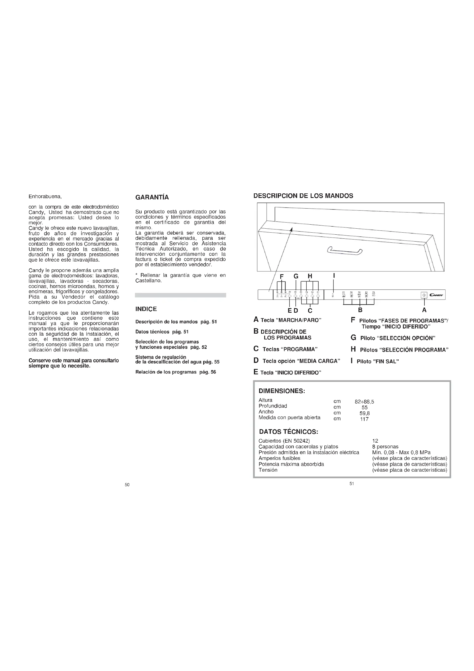 Enhorabuena, con la compra de este electrodoméstico Candy, Usted ha demostrado que no acepta promesas: Usted desea lo mejor. Candy le ofrece este nuevo lavavajillas, fruto de años de investigación y experiencia en el mercado gracias al contacto directo con los Consumidores. Usted ha escogido la calidad, la duración y las grandes prestaciones que le ofrece este lavavajillas. Candy le propone además una amplia gama de electrodomésticos: lavadoras, lavavajillas, lavadoras - secadoras, cocinas, hornos microondas, hornos y encimeras, frigorîficos y congeladores. Pida a su Vendedor el catálogo completo de los productos Candy. Le rogamos que lea atentamente las instrucciones que contiene este manual ya que le proporcionarán importantes indicaciones relacionadas con la seguridad de la instalación, el uso, el mantenimiento así como ciertos consejos útiles para una mejor utilización del lavavajillas. Conserve este manual para consultarlo siempre que lo necesite. GARANTÍA Su producto está garantizado por las condiciones y términos especificados en el certificado de garantía del mismo. La garantía deberá ser conservada, debidamente rellenada, para ser mostrada al Servicio de Asistencia Técnica Autorizado, en caso de intervención conjuntamente con la factura o ticket de compra expedido por el establecimiento vendedor.