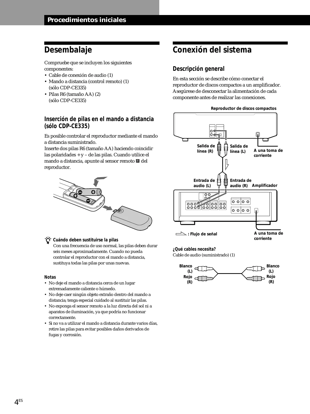 Compruebe que se incluyen los siguientes componentes: • Cable de conexión de audio (1) • Mando a distancia (control remoto) (1) (sólo CDP-CE335) • Pilas R6 (tamaño AA) (2) (sólo CDP-CE335)