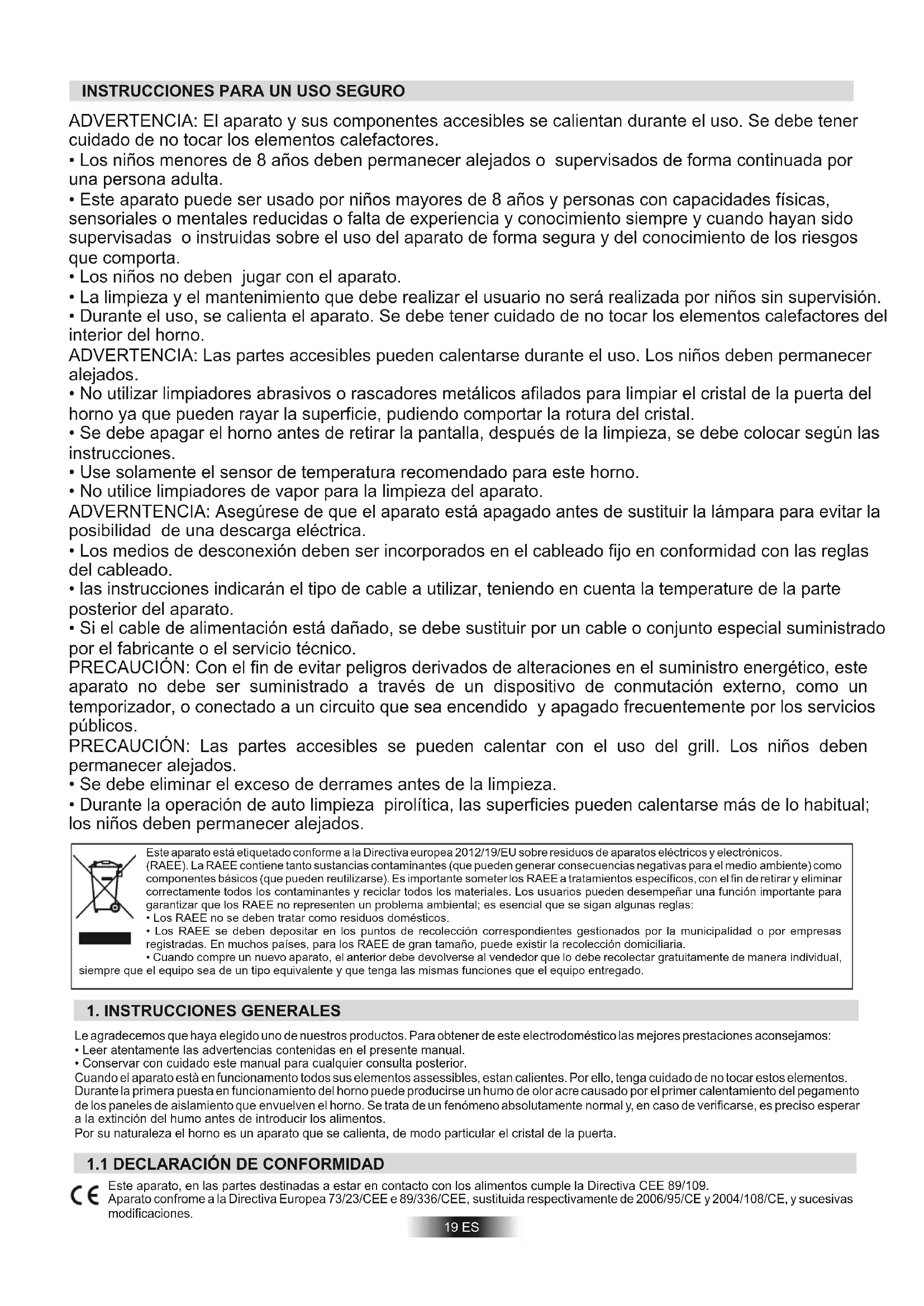- Conservar con cuidado este manual para cualquier consulta posterior. Cuando el aparato està en funcionamento todos sus elementos assessibles, estan calientes. Por ello, tenga cuidado de no tocar estos elementos. Durante la primera puesta en funcionamiento del horno puede producirse un humo de olor acre causado por el primer calentamiento del pegamento de los paneles de aislamiento que envuelven el horno. Se trata de un fenómeno absolutamente normal y, en caso de verificarse, es preciso esperar a la extinción del humo antes de introducir los alimentos. Por su naturaleza el horno es un aparato que se calienta, de modo particular el cristal de la puerta. Este aparato, en las partes destinadas a estar en contacto con los alimentos cumple la Directiva CEE 89/109. Aparato confrome a la Directiva Europea 73/23/CEE e 89/336/CEE, sustituida respectivamente de 2006/95/CE y 2004/108/CE, y sucesivas modificaciones.