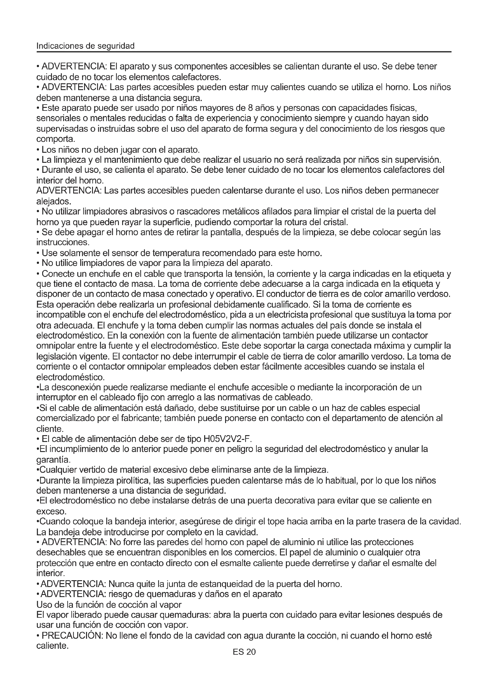 - PRECAUCIÓN: No llene el fondo de la cavidad con agua durante la cocción, ni cuando el horno esté caliente. Indicaciones de seguridad ES 20Limpieza y mantenimiento del horno Advertencias generales