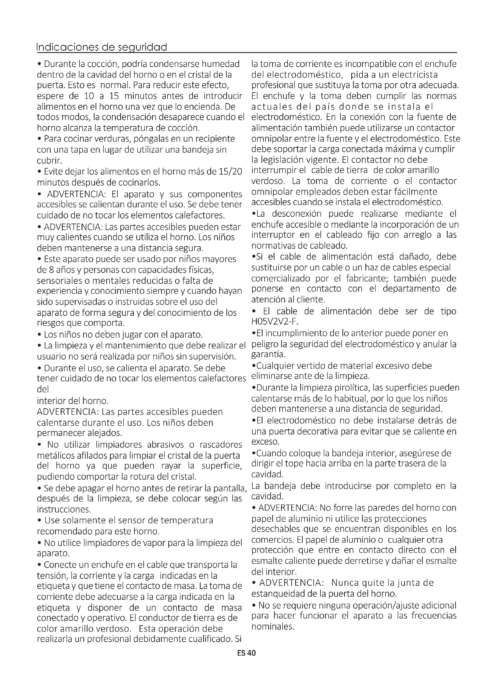 - Durante la cocción, podría condensarse humedad dentro de la cavidad del horno o en el cristal de la puerta. Esto es normal. Para reducir este efecto, espere de 10 a 15 minutos antes de introducir alimentos en el horno una vez que lo encienda. De todos modos, la condensación desaparece cuando el horno alcanza la temperatura de cocción. interior del horno. ADVERTENCIA: Las partes accesibles pueden calentarse durante el uso. Los niños deben permanecer alejados.