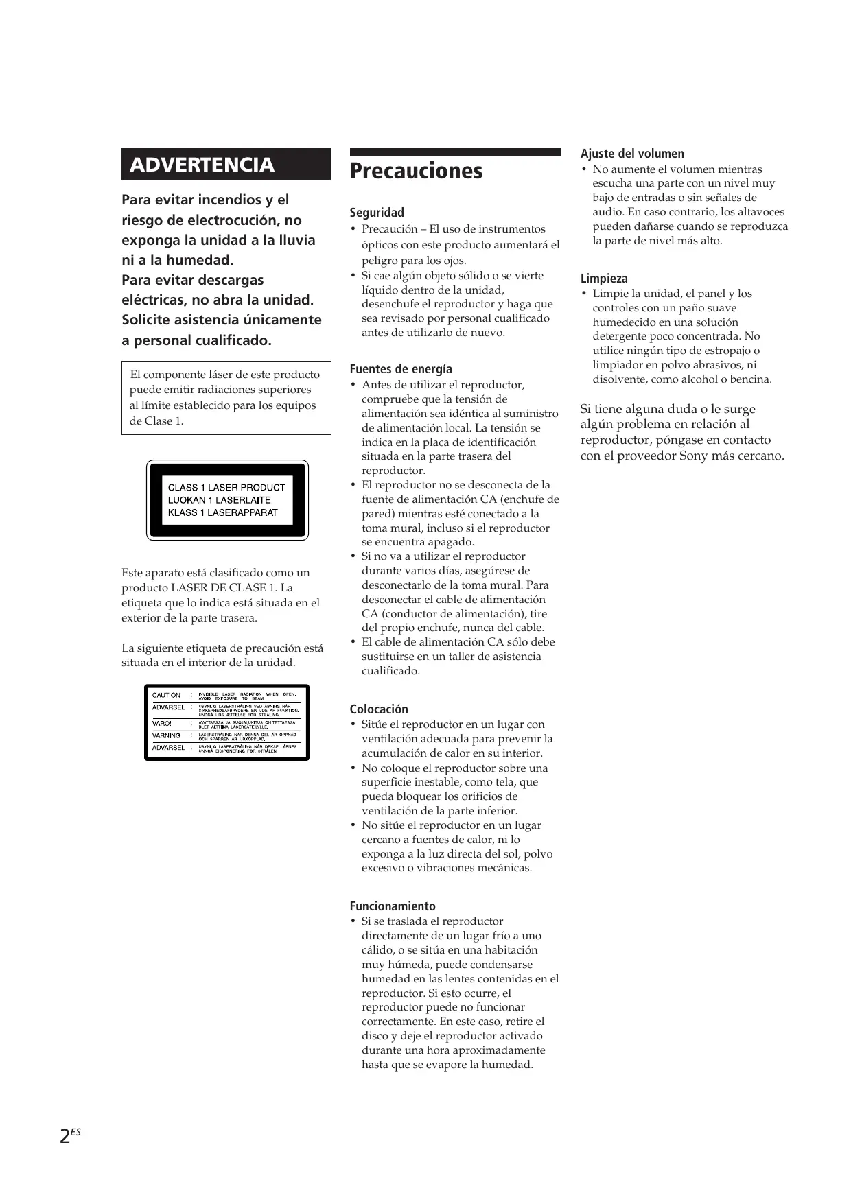 Para evitar descargas eléctricas, no abra la unidad. Solicite asistencia únicamente a personal cualificado. El componente láser de este producto puede emitir radiaciones superiores al límite establecido para los equipos de Clase 1.