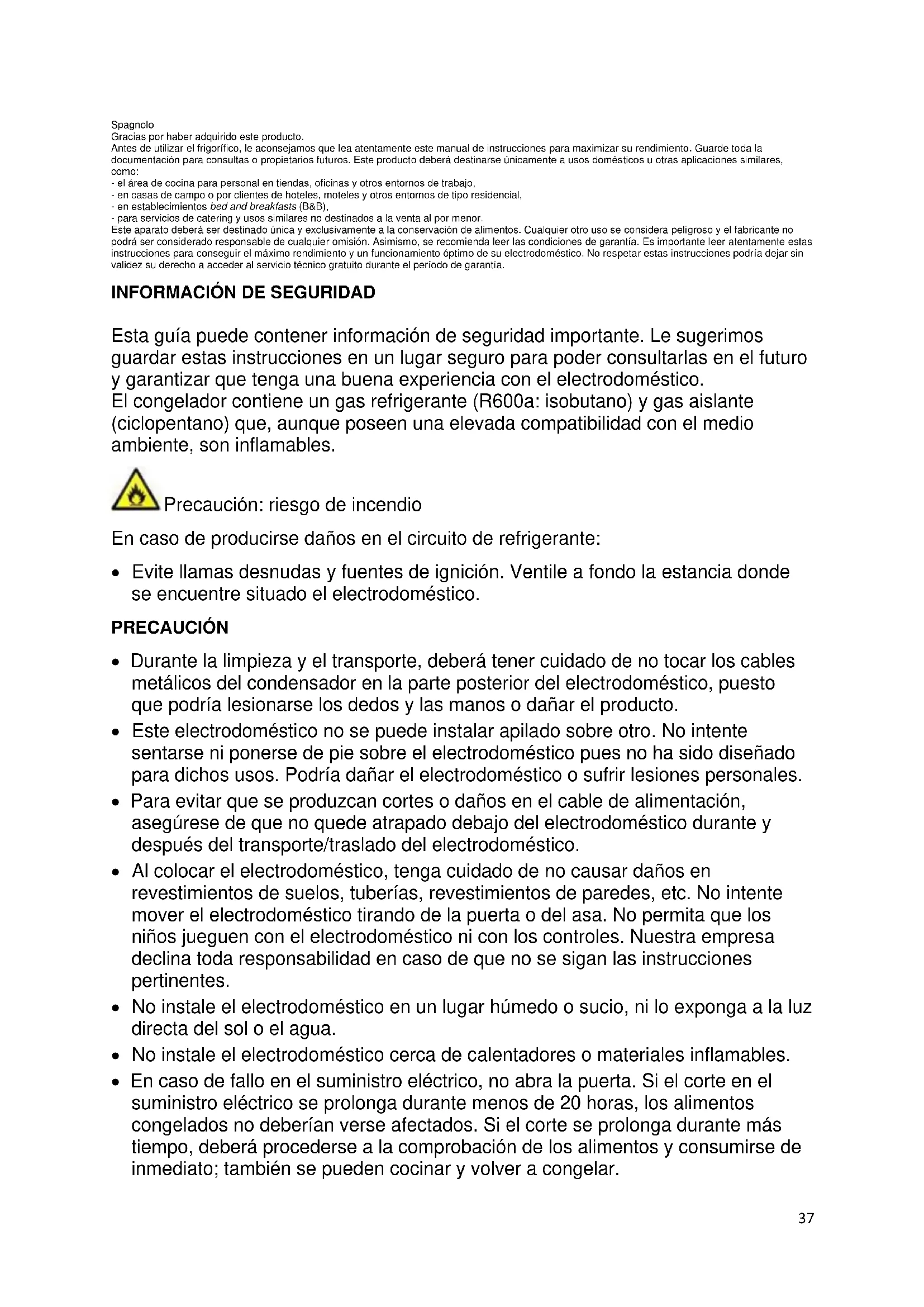 Esta guía puede contener información de seguridad importante. Le sugerimos guardar estas instrucciones en un lugar seguro para poder consultarlas en el futuro y garantizar que tenga una buena experiencia con el electrodoméstico. El congelador contiene un gas refrigerante (R600a: isobutano) y gas aislante (ciclopentano) que, aunque poseen una elevada compatibilidad con el medio ambiente, son inflamables. Precaución: riesgo de incendio En caso de producirse daños en el circuito de refrigerante: