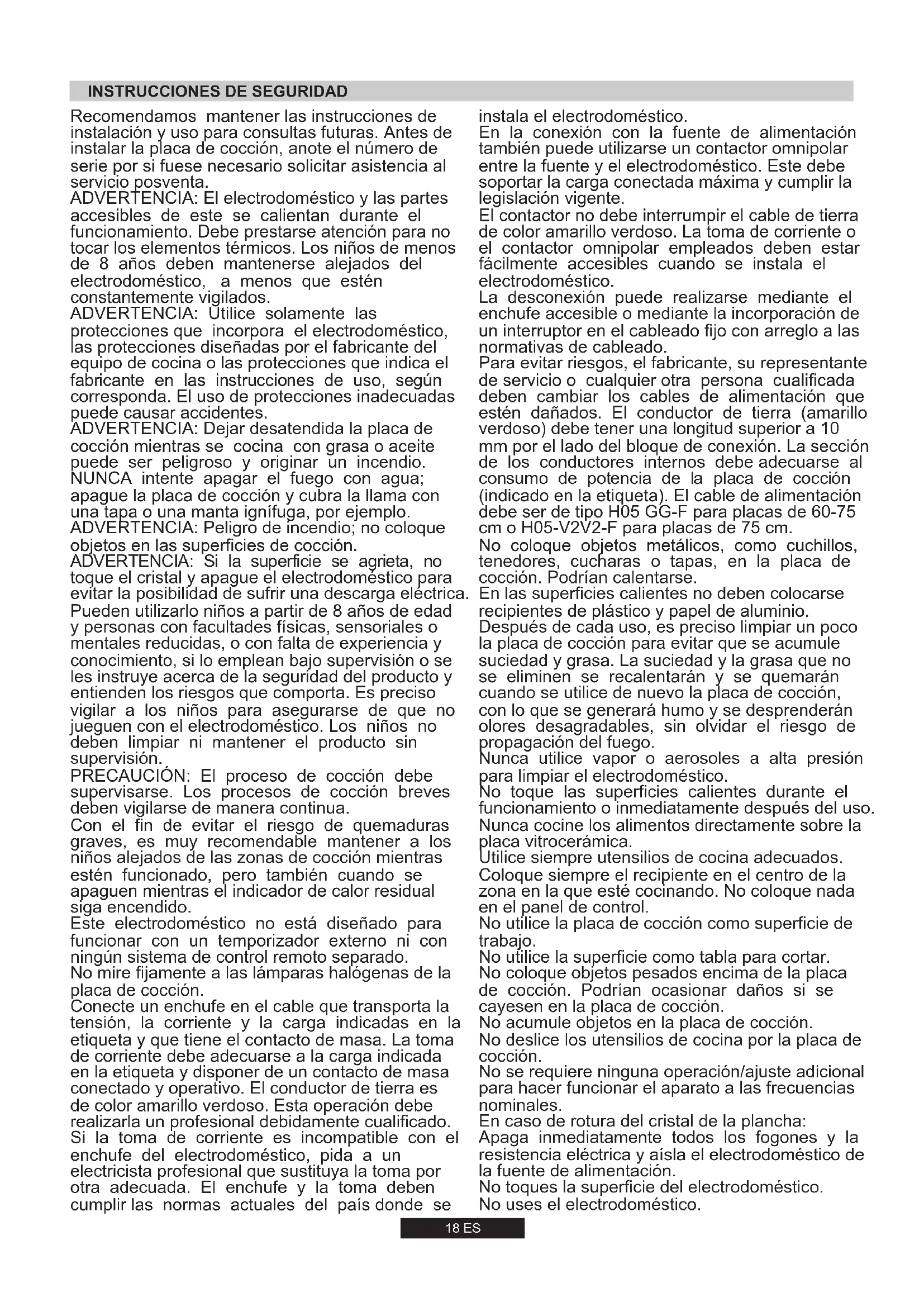 560 g/h 220-240V 50/60Hz -18 ES No mire fijamente a las lámparas halógenas de la placa de cocción. Conecte un enchufe en el cable que transporta la tensión, la corriente y la carga indicadas en la etiqueta y que tiene el contacto de masa. La toma de corriente debe adecuarse a la carga indicada en la etiqueta y disponer de un contacto de masa conectado y operativo. El conductor de tierra es de color amarillo verdoso. Esta operación debe realizarla un profesional debidamente cualificado. Si la toma de corriente es incompatible con el enchufe del electrodoméstico, pida a un electricista profesional que sustituya la toma por otra adecuada. El enchufe y la toma deben cumplir las normas actuales del país donde se Recomendamos mantener las instrucciones de instalación y uso para consultas futuras. Antes de instalar la placa de cocción, anote el número de serie por si fuese necesario solicitar asistencia al servicio posventa. ADVERTENCIA: Utilice solamente las protecciones que incorpora el electrodoméstico, las protecciones diseñadas por el fabricante del equipo de cocina o las protecciones que indica el fabricante en las instrucciones de uso, según corresponda. El uso de protecciones inadecuadas puede causar accidentes. ADVERTENCIA: Dejar desatendida la placa de cocción mientras se cocina con grasa o aceite puede ser peligroso y originar un incendio. NUNCA intente apagar el fuego con agua; apague la placa de cocción y cubra la llama con una tapa o una manta ignífuga, por ejemplo. ADVERTENCIA: Si la superficie se agrieta, no toque el cristal y apague el electrodoméstico para evitar la posibilidad de sufrir una descarga eléctrica. ADVERTENCIA: El electrodoméstico y las partes accesibles de este se calientan durante el funcionamiento. Debe prestarse atención para no tocar los elementos térmicos. Los niños de menos de 8 años deben mantenerse alejados del electrodoméstico, a menos que estén constantemente vigilados. ADVERTENCIA: Peligro de incendio; no coloque objetos en las superficies de cocción. Pueden utilizarlo niños a partir de 8 años de edad y personas con facultades físicas, sensoriales o mentales reducidas, o con falta de experiencia y conocimiento, si lo emplean bajo supervisión o se les instruye acerca de la seguridad del producto y entienden los riesgos que comporta. Es preciso vigilar a los niños para asegurarse de que no jueguen con el electrodoméstico. Los niños no deben limpiar ni mantener el producto sin supervisión. PRECAUCIÓN: El proceso de cocción debe supervisarse. Los procesos de cocción breves deben vigilarse de manera continua. Con el fin de evitar el riesgo de quemaduras graves, es muy recomendable mantener a los niños alejados de las zonas de cocción mientras estén funcionado, pero también cuando se apaguen mientras el indicador de calor residual siga encendido. Este electrodoméstico no está diseñado para funcionar con un temporizador externo ni con ningún sistema de control remoto separado.