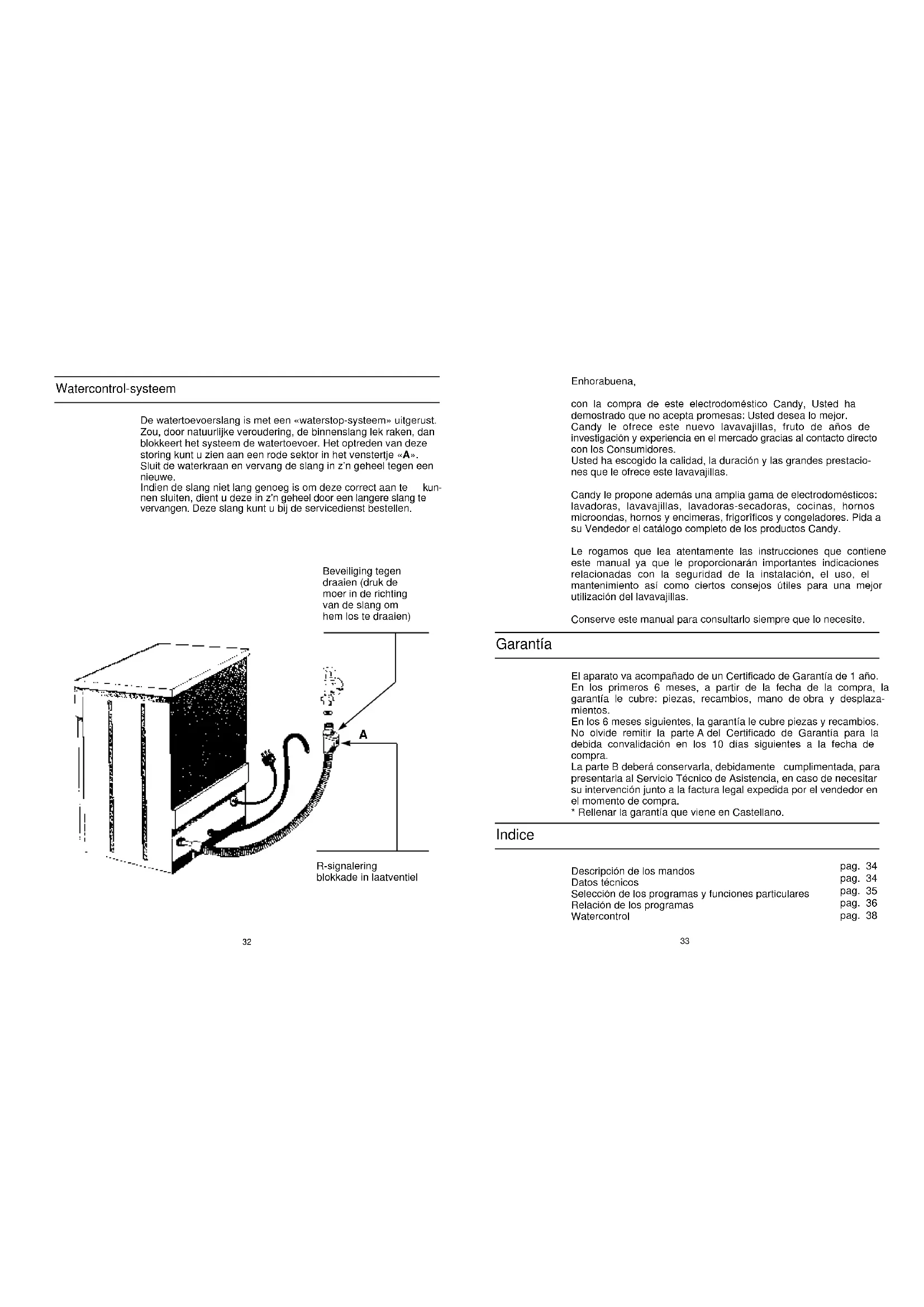 - Rellenar la garantía que viene en Castellano. Descripción de los mandos Datos técnicos Selección de los programas y funciones particulares Relación de los programas Watercontrol pag. 34 pag. 34 pag. 35 pag. 36 pag. 38 Garantía Indice35 Atencion Este lavavajillas está dotado de un dispositivo de seguridad antidesbordamiento, que también funciona sin energía eléctrica, bloquea automáticamente el flujo del agua, en el caso que ésta supere el nivel normal a causa de un mal funcionamiento. Importante Para evitar que se dispare el dispositivo de seguridad anti-desbordamiento, se recomienda no mover o inclinar el lavavajillas durante el funcionamiento. En el caso que sea necesario mover o inclinar el lavavajillas, asegurarse primero que haya completado el ciclo de lavado y que no quede agua en la cuba. Para seleccionar el programa, girar el mando en sentido horario hasta hacer coindicir el índice con el símbolo del programa seleccionado sobre el panel de mandos, y presionar entonces el mando paro/marcha. Asegurarse de que el grifo del agua está abierto, y la puerta bien cerrada. Tecla “70°C” La tecla “70°C” en los ciclos UNIVERSAL INTENSIVO 70°C y DIARIO INTENSIVO 70°C, aumenta la tempratura del agua de 50° C a 70° C. Tecla Extra aclarado Permite añadir un aclarado mas. Tecla media carga Pulsando esta tecla se puede elegir lavar uma cantidad reducida de vajillas concentrando toda la carga sobre el cesto superior excluídos los cubiertos que deberán ser colocados en la cesta especifica en el cesto inferior. La elección de esta función permite reducir los consumos de agua y energia. Para el lavado dosificar el detergente en cantidad menor a la aconsejada para el lavado normal. Uso del mando “retardador de inicio” Este mando controla un temporizador que le permite progra- mar el inicio de la máquina con un retardo comprendido entre 1 y 12 horas. La operación debe ser efectuada antes de pre- sionar la tecla de puesta en marcha. El ciclo ha terminado Cuando el mando programas alcanza el símbolo el ciclo ha terminado. Presione la tecla de paro/marcha para quitar tensión del lava- vajillas y sólo posteriormente abra la puerta. Selección de los programas y funciones especiales