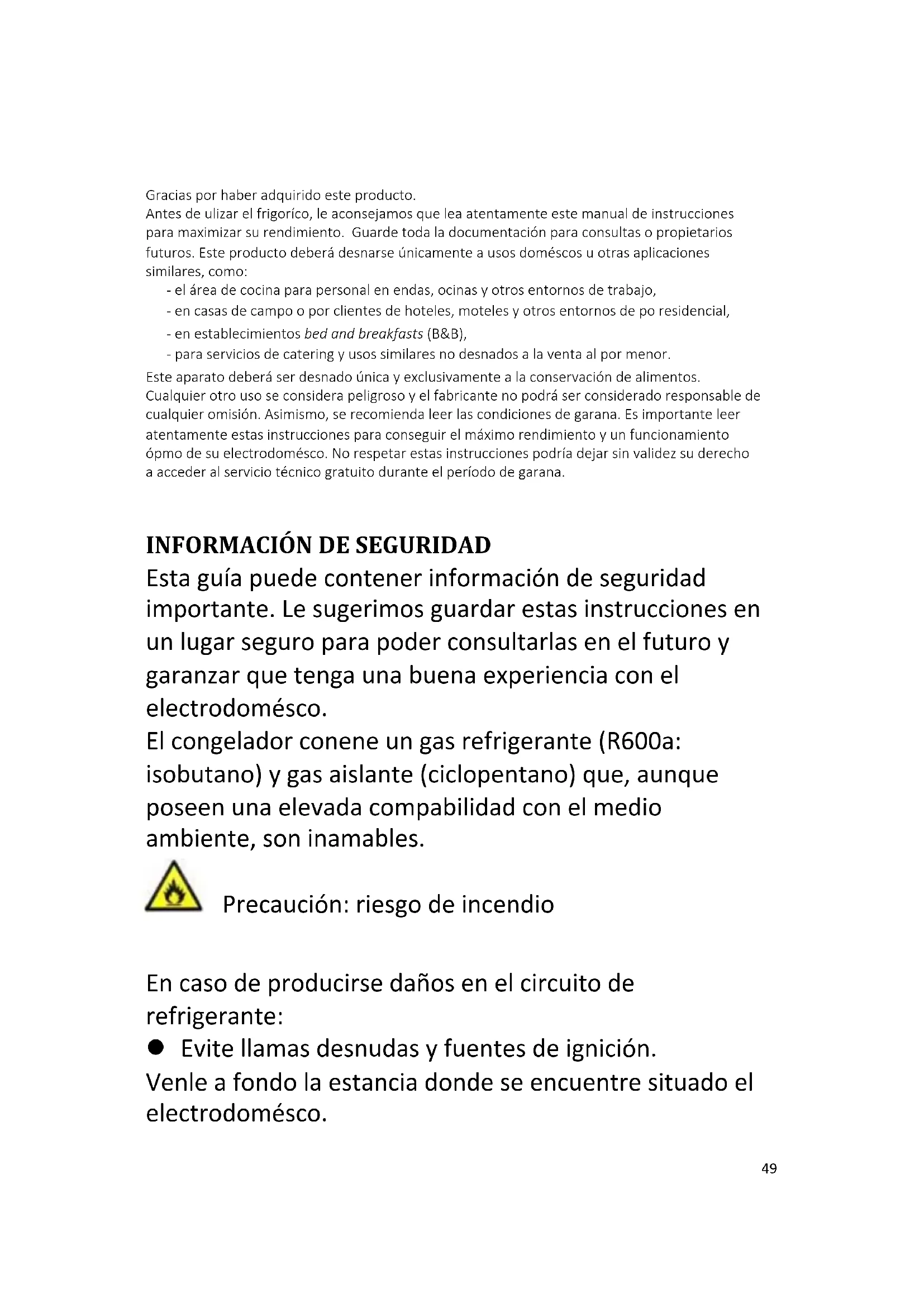 - RESOLUCIÓN DE PROBLEMAS Gracias por haber adquirido este producto. Antes de utilizar el frigorífico, le aconsejamos que lea atentamente este manual de instrucciones para maximizar su rendimiento. Guarde toda la documentación para consultas o propietarios futuros. Este producto deberá destinarse únicamente a usos domésticos u otras aplicaciones similares, como: - el área de cocina para personal en tiendas, oficinas y otros entornos de trabajo, - en casas de campo o por clientes de hoteles, moteles y otros entornos de tipo residencial, - en establecimientos bed and breakfasts (B&B), - para servicios de catering y usos similares no destinados a la venta al por menor. Este aparato deberá ser destinado única y exclusivamente a la conservación de alimentos. Cualquier otro uso se considera peligroso y el fabricante no podrá ser considerado responsable de cualquier omisión. Asimismo, se recomienda leer las condiciones de garantía. Es importante leer atentamente estas instrucciones para conseguir el máximo rendimiento y un funcionamiento óptimo de su electrodoméstico. No respetar estas instrucciones podría dejar sin validez su derecho a acceder al servicio técnico gratuito durante el período de garantía. p. 6149