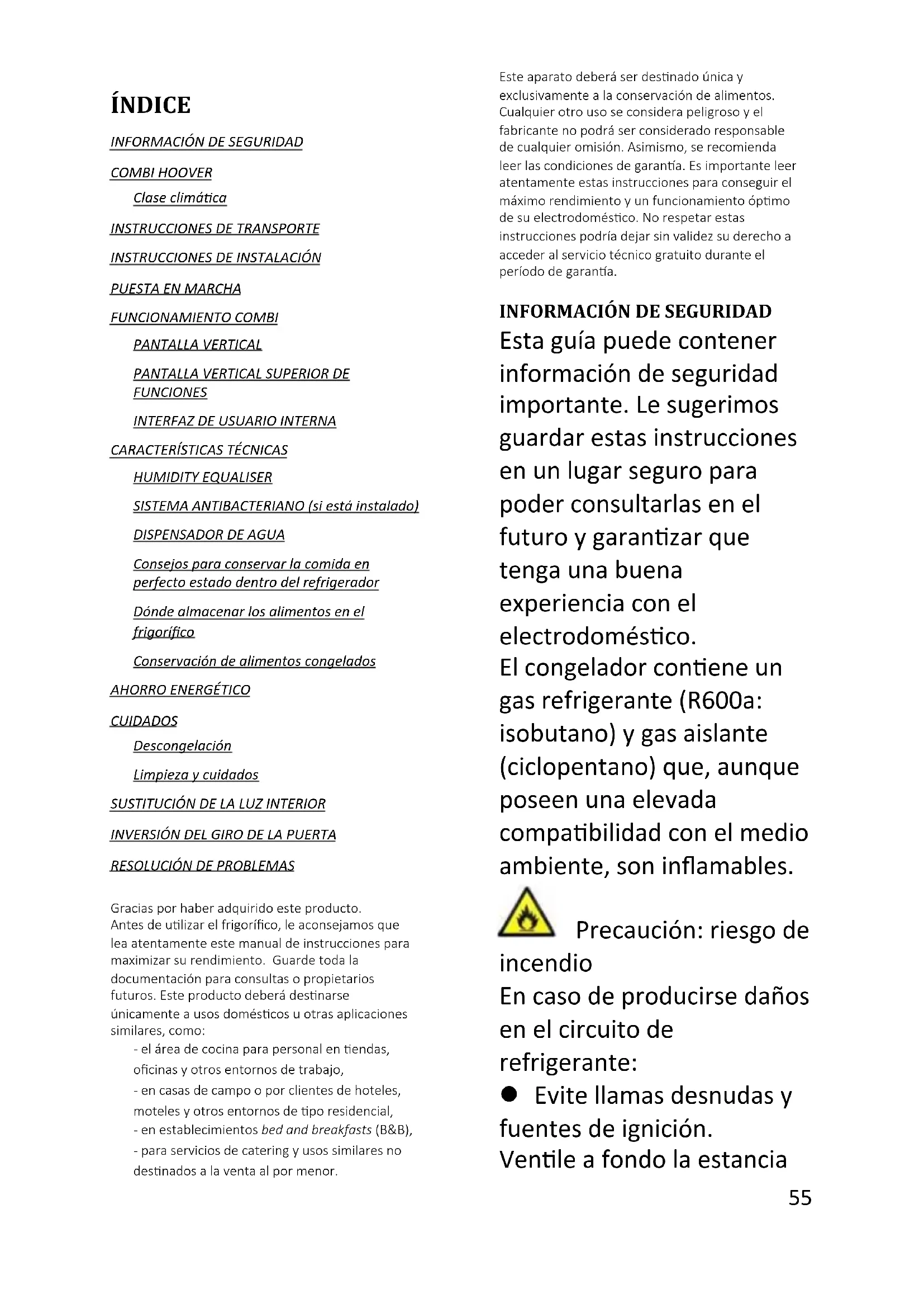 RECHANGE Les thermostats, les capteurs de température, les cartes de circuit imprimé et les sources lumineuses sont disponibles pour une période minimale de sept ans à compter de la mise sur le marché de la dernière unité du modèle; Les poignées de porte, gonds de porte, plateaux et bacs, sont disponibles pour une période minimale de sept ans, et les joints de porte sont disponibles pour une période minimale de 10 ans à compter de la mise sur le marché de la dernière unité du modèle; Pour plus d'informations sur le produit, veuillez consulter https://eprel.ec.europa.eu/ ou scannez le QR sur l'étiquette énergétique fournie avec l'appareil55 Español ÍNDICE INFORMACIÓN DE SEGURIDAD COMBI HOOVER Clase climática INSTRUCCIONES DE TRANSPORTE INSTRUCCIONES DE INSTALACIÓN PUESTA EN MARCHA FUNCIONAMIENTO COMBI PANTALLA VERTICAL PANTALLA VERTICAL SUPERIOR DE FUNCIONES INTERFAZ DE USUARIO INTERNA CARACTERÍSTICAS TÉCNICAS HUMIDITY EQUALISER SISTEMA ANTIBACTERIANO (si está instalado) DISPENSADOR DE AGUA Consejos para conservar la comida en perfecto estado dentro del refrigerador Dónde almacenar los alimentos en el frigorífico Conservación de alimentos congelados AHORRO ENERGÉTICO CUIDADOS Descongelación Limpieza y cuidados SUSTITUCIÓN DE LA LUZ INTERIOR INVERSIÓN DEL GIRO DE LA PUERTA RESOLUCIÓN DE PROBLEMAS Gracias por haber adquirido este producto. Antes de utilizar el frigorífico, le aconsejamos que lea atentamente este manual de instrucciones para maximizar su rendimiento. Guarde toda la documentación para consultas o propietarios futuros. Este producto deberá destinarse únicamente a usos domésticos u otras aplicaciones similares, como: - el área de cocina para personal en tiendas, oficinas y otros entornos de trabajo, - en casas de campo o por clientes de hoteles, moteles y otros entornos de tipo residencial, - en establecimientos bed and breakfasts (B&B), - para servicios de catering y usos similares no destinados a la venta al por menor. Este aparato deberá ser destinado única y exclusivamente a la conservación de alimentos. Cualquier otro uso se considera peligroso y el fabricante no podrá ser considerado responsable de cualquier omisión. Asimismo, se recomienda leer las condiciones de garantía. Es importante leer atentamente estas instrucciones para conseguir el máximo rendimiento y un funcionamiento óptimo de su electrodoméstico. No respetar estas instrucciones podría dejar sin validez su derecho a acceder al servicio técnico gratuito durante el período de garantía.