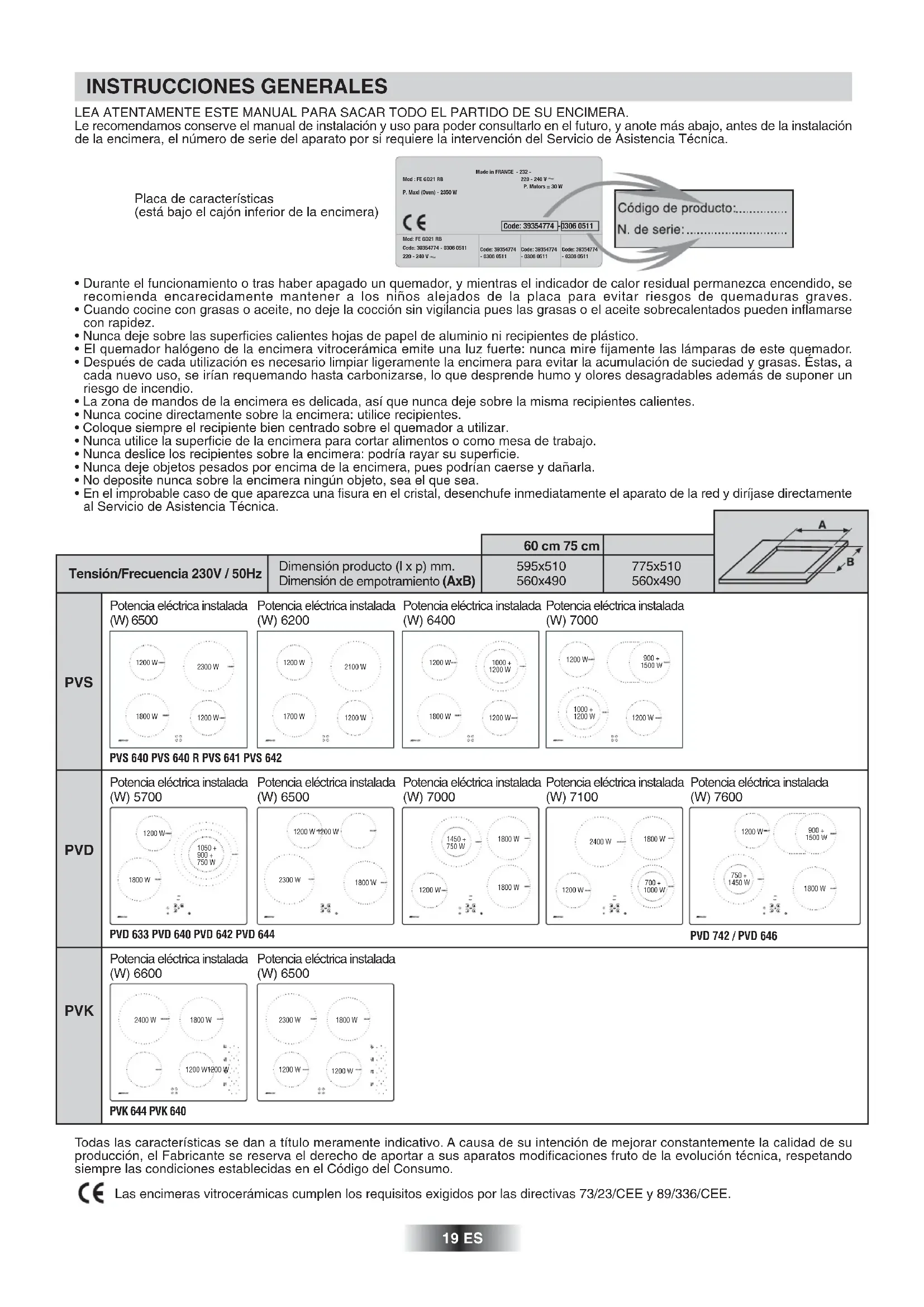 - En el improbable caso de que aparezca una fisura en el cristal, desenchufe inmediatamente el aparato de la red y diríjase directamente al Servicio de Asistencia Técnica. Dimensión producto (l x p) mm. Dimensión de empotramiento (AxB) Tensión/Frecuencia 230V / 50Hz 60 cm 75 cm 595x510 560x490 775x510 560x490 PVS PVD PVK 1200 W2300 W1800 W1200 W1200 W1200 W1700 W2100 W1200 W1200 W1800 W1000 +1200 W1200 W1000 +1200 W1200 W900 +1500 W Potencia eléctrica instalada (W) 6500 Potencia eléctrica instalada (W) 6200 Potencia eléctrica instalada (W) 6400 Potencia eléctrica instalada (W) 7000 1800 W1200 W1050 +900 +750 W1200 W 1200 W2300 W1800 W1200 W1800 W1800 W1450 +750 W2400 W1800 W1200 W700 +1000 W750 +1450 W1800 W900 +1500 W1200 W Potencia eléctrica instalada (W) 5700 Potencia eléctrica instalada (W) 6500 Potencia eléctrica instalada (W) 7000 Potencia eléctrica instalada (W) 7100 Potencia eléctrica instalada (W) 7600 1800 W1200 W1200 W2400 W1200 W1200 W1800 W2300 W Potencia eléctrica instalada (W) 6600 Potencia eléctrica instalada (W) 6500