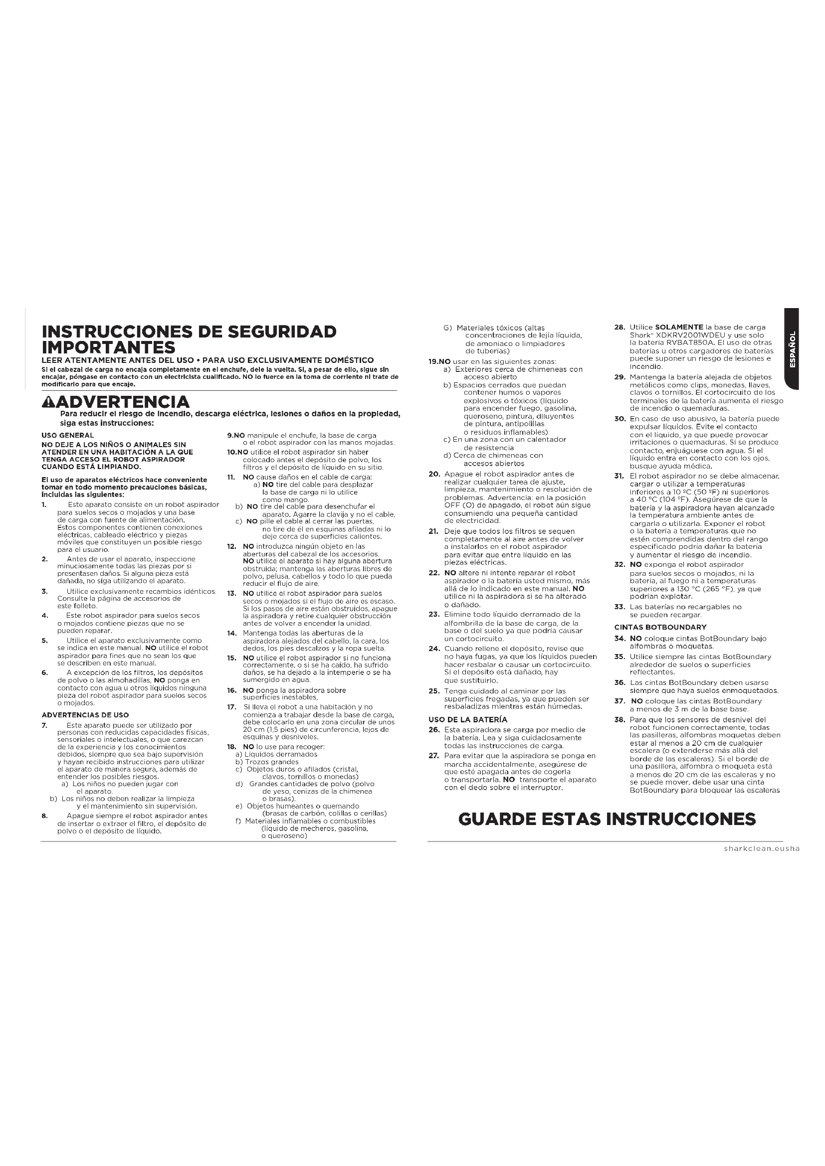 Shark® XDKRV2001WDEU y use solo la batería RVBAT850A. El uso de otras baterías u otros cargadores de baterías puede suponer un riesgo de lesiones e incendio.