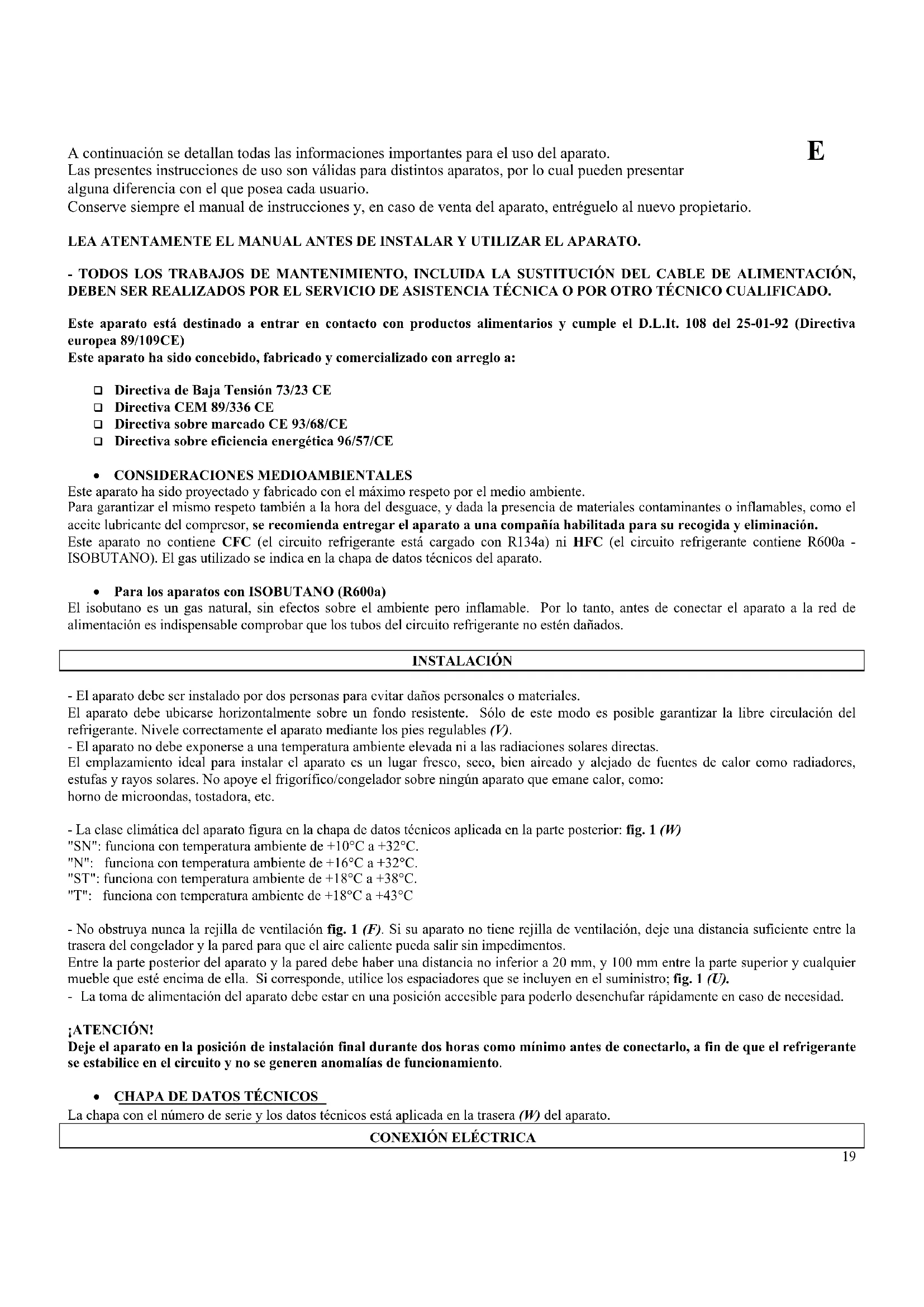 - Para los aparatos con ISOBUTANO (R600a) El isobutano es un gas natural, sin efectos sobre el ambiente pero inflamable. Por lo tanto, antes de conectar el aparato a la red de alimentación es indispensable comprobar que los tubos del circuito refrigerante no estén dañados. INSTALACIÓN - El aparato debe ser instalado por dos personas para evitar daños personales o materiales. El aparato debe ubicarse horizontalmente sobre un fondo resistente. Sólo de este modo es posible garantizar la libre circulación del refrigerante. Nivele correctamente el aparato mediante los pies regulables (V). - El aparato no debe exponerse a una temperatura ambiente elevada ni a las radiaciones solares directas. El emplazamiento ideal para instalar el aparato es un lugar fresco, seco, bien aireado y alejado de fuentes de calor como radiadores, estufas y rayos solares. No apoye el frigorífico/congelador sobre ningún aparato que emane calor, como: horno de microondas, tostadora, etc. - La clase climática del aparato figura en la chapa de datos técnicos aplicada en la parte posterior: fig. 1 (W) "SN": funciona con temperatura ambiente de +10°C a +32°C. "N": funciona con temperatura ambiente de +16°C a +32°C. "ST": funciona con temperatura ambiente de +18°C a +38°C. "T": funciona con temperatura ambiente de +18°C a +43°C - No obstruya nunca la rejilla de ventilación fig. 1 (F). Si su aparato no tiene rejilla de ventilación, deje una distancia suficiente entre la trasera del congelador y la pared para que el aire caliente pueda salir sin impedimentos. Entre la parte posterior del aparato y la pared debe haber una distancia no inferior a 20 mm, y 100 mm entre la parte superior y cualquier mueble que esté encima de ella. Si corresponde, utilice los espaciadores que se incluyen en el suministro; fig. 1 (U). - La toma de alimentación del aparato debe estar en una posición accesible para poderlo desenchufar rápidamente en caso de necesidad. ¡ATENCIÓN! Deje el aparato en la posición de instalación final durante dos horas como mínimo antes de conectarlo, a fin de que el refrigerante se estabilice en el circuito y no se generen anomalías de funcionamiento.
