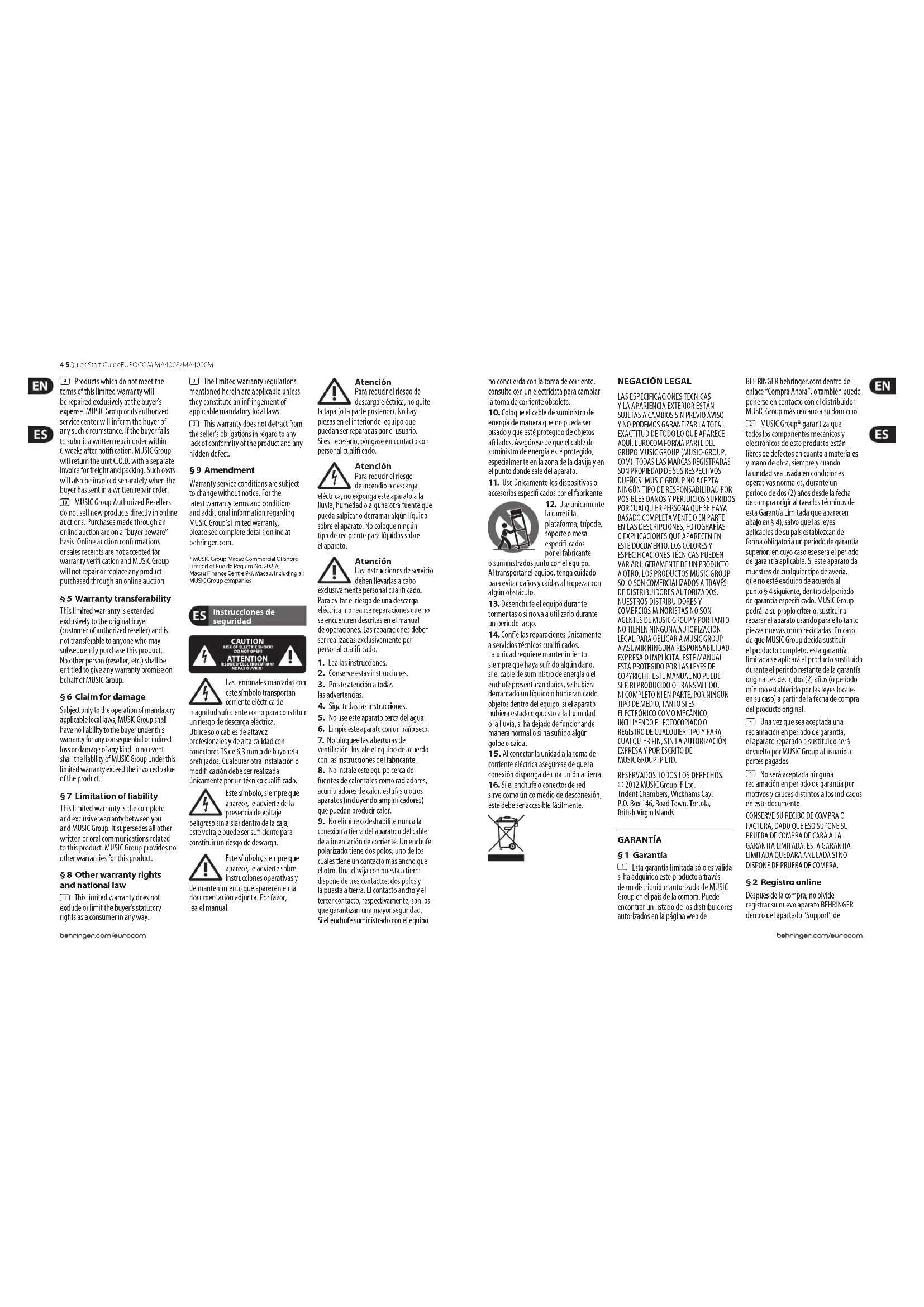 los daños/averías producidos por desastres naturales/fenómenos atmosféricos (accidentes, incendios, inundaciones) o cualquier otra situación que quede fuera del control de MUSICGroup. (7) La reparación de este aparato o la apertura de su carcasa por cualquier persona no autorizada (incluyendoelpropio usuario) anularáesta garantíalimitada. (8) En caso de que un examen de este aparato por parte de MUSICGroup demuestre que el defecto o avería en cuestión no queda cubierto por esta garantía limitada, el coste de dicha inspección deberá ser pagado por elusuario. (9) Aquellos productos que no cumplan con los términos de esta garantía limitada serán reparados EXCLUSIVAMENTE con cargo al usuario. MUSICGroup o sus servicios técnicos o ciales informarán al usuario en caso de que se produzca esa circunstancia. Siel usuario no remite una autorización de reparación por escrito en las 6semanas siguientes a nuestra noti cación, MUSICGroup devolverá la unidad a portes debidos, juntocon una factura por los gastos. En caso de que el usuario haya remitido la autorización de reparación, esoscostes también le serán facturadosaparte. (10) Ningún distribuidor o cial MUSICGroup está autorizado para vender productos nuevos directamente en subastas online. Loscompradores que accedan a este tipo de subastas se harán responsables plenamente de esas compras. Las con rmaciones o recibos de compras de subastas online no son válidas como veri caciones de garantía, por lo que MUSICGroup no reparará ni sustituirá ningún producto que haya sido adquirido a través de este tipo desistemas. § 5 Transferibilidad de lagarantía Esta garantía limitada cubre exclusivamente al comprador original (comprador nal o comercio minorista) y no es transferible a terceras personas que puedan adquirir posteriormente este producto. Ningunapersona (distribuidor, comercio minorista) está autorizado a ofrecer ningún otro tipo de garantía o compromiso en nombrede MUSICGroup. § 6 Reclamaciones Con las limitaciones propias de las normativas y leyes locales aplicables, MUSICGroup no será responsable de cara al comprador por el daño emergente, lucro cesante o daños y perjuicios de cualquier tipo. Bajo ningún concepto la responsabilidad de MUSICGroup por esta garantía limitada sobrepasará el valor de este producto de acuerdo a la factura. § 7 Limitación de responsabilidades Esta garantía limitada es la única y exclusiva garantía entre Vd. yMUSICGroup. Esta garantía sustituye a cualquier otra comunicación verbal o escrita relacionada con este aparato. MUSICGroup no ofrece ninguna otra garantía relativa a esteproducto. § 8 Otros derechos de garantías y Leyesnacionales (1) Esta garantía limitada no excluye ni limita los derechos legales propios del comprador como tal. (2) Los puntos de esta garantía limitada y mencionados aquí son aplicables salvo en el caso de que supongan la infracción de cualquier legislación local aplicable. (3) Esta garantía no limita la obligación del vendedor en lo relativo a la conformidad de este aparato de acuerdo a las leyes y las responsabilidades por vicios ocultos. § 9 Notas nales Las condiciones de este servicio de garantía están sujetas a cambios sin previo aviso. Siquiere consultar los términos y condiciones de garantía actualizados, asícomo información adicional sobre la garantía limitada de MUSICGroup, consultetodos los detalles online en la página web behringer. com.