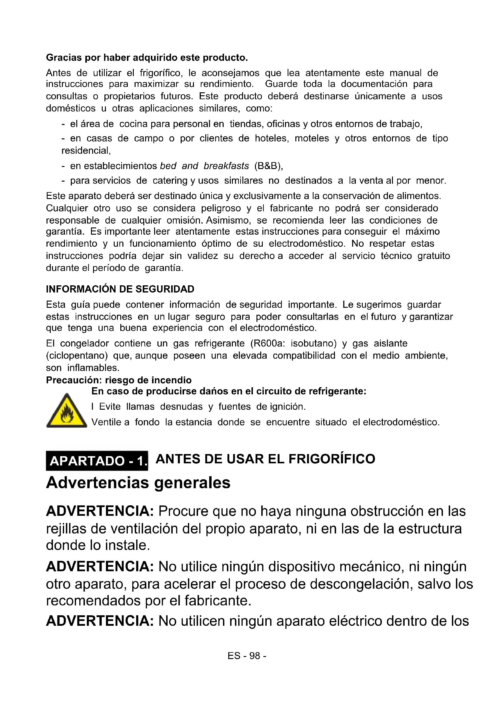 Todas las informaciones incluidas en este manual podrían verse sujetas a errores tipográficos o de otra índole y por tanto diferir del producto real.ES - 98 - Gracias por haber adquirido este producto. Antes de utilizar el frigorífico, le aconsejamos que lea atentamente este manual de instrucciones para maximizar su rendimiento. Guarde toda la documentación para consultas o propietarios futuros. Este producto deberá destinarse únicamente a usos domésticos u otras aplicaciones similares, como: - el área de cocina para personal en tiendas, oficinas y otros entornos de trabajo, - en casas de campo o por clientes de hoteles, moteles y otros entornos de tipo residencial, - en establecimientos bed and breakfasts (B&B), - para servicios de catering y usos similares no destinados a la venta al por menor. Este aparato deberá ser destinado única y exclusivamente a la conservación de alimentos. Cualquier otro uso se considera peligroso y el fabricante no podrá ser considerado responsable de cualquier omisión. Asimismo, se recomienda leer las condiciones de garantía. Es importante leer atentamente estas instrucciones para conseguir el máximo rendimiento y un funcionamiento óptimo de su electrodoméstico. No respetar estas instrucciones podría dejar sin validez su derecho a acceder al servicio técnico gratuito durante el período de garantía. APARTADO - 1.