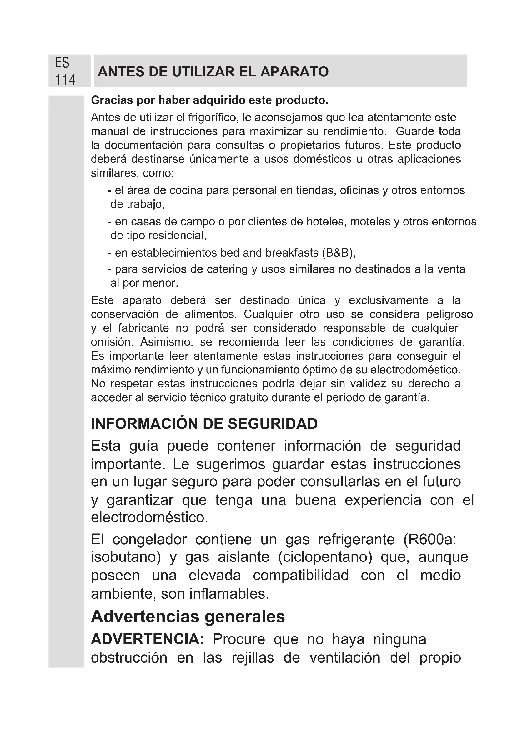 Esta guía puede contener información de seguridad importante. Le sugerimos guardar estas instrucciones en un lugar seguro para poder consultarlas en el futuro y garantizar que tenga una buena experiencia con el electrodoméstico. El congelador contiene un gas refrigerante (R600a: isobutano) y gas aislante (ciclopentano) que, aunque poseen una elevada compatibilidad con el medio ambiente, son inamables. Advertencias generales ADVERTENCIA: Procure que no haya ninguna obstrucción en las rejillas de ventilación del propio
