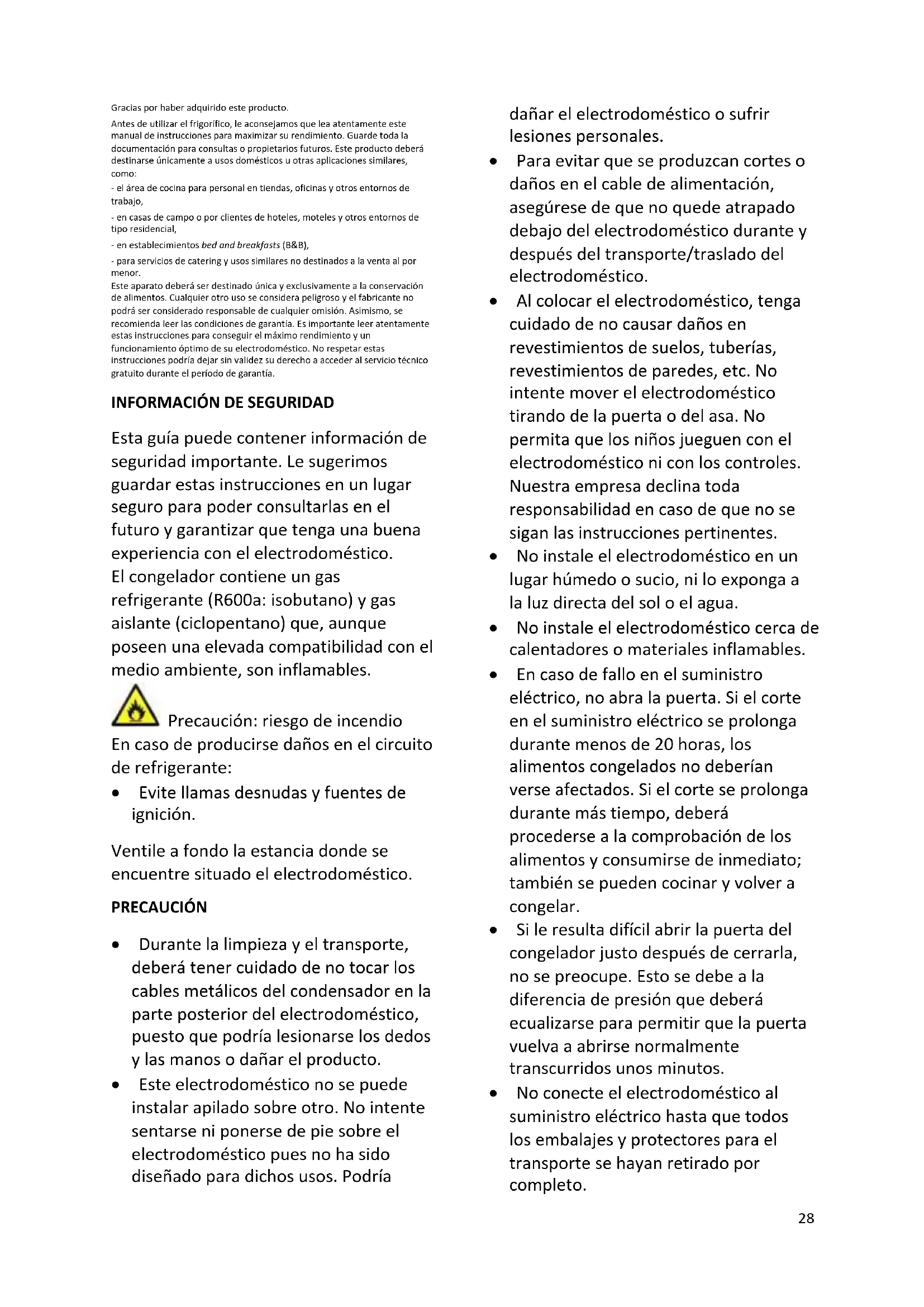 Esta guía puede contener información de seguridad importante. Le sugerimos guardar estas instrucciones en un lugar seguro para poder consultarlas en el futuro y garantizar que tenga una buena experiencia con el electrodoméstico. El congelador contiene un gas refrigerante (R600a: isobutano) y gas aislante (ciclopentano) que, aunque poseen una elevada compatibilidad con el medio ambiente, son inflamables. Precaución: riesgo de incendio En caso de producirse daños en el circuito de refrigerante:
