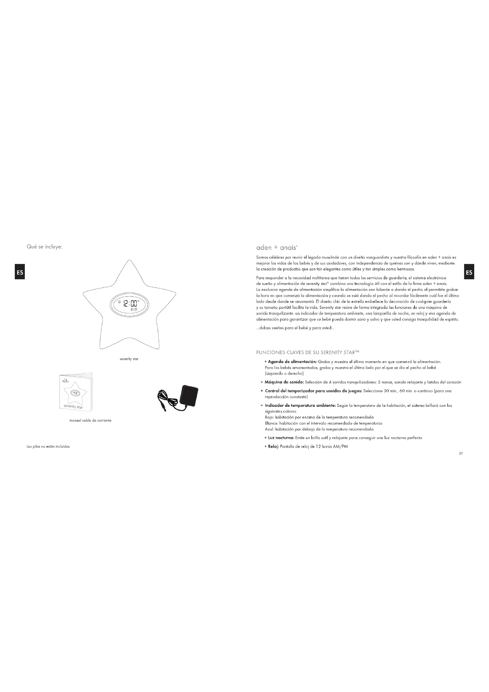 Usted, como usuario final, tiene la obligación legal (ordenanza de pilas) de devolver todas las pilas y pilas recargables que estén gastadas. Está prohibida su eliminación con los desechos domésticos. Las pilas de la “Directiva Europea 2006/66/CE”, incluyendo las pilas recargables, que contienen sustancias peligrosas están marcadas con símbolos que indican la prohibición de desechar en los residuos domésticos. Las designaciones para los metales pesados afectados son las siguientes: Cd = cadmio, Hg = mercurio, Pd = plomo. Puede devolver las pilas y pilas recargables gastadas de forma gratuita en los puntos de recogida de su comunidad o en cualquier otro lugar en el que se vendan las pilas o pilas recargables. Usted así cumple con sus obligaciones estatutarias y ayuda a proteger el medio ambiente. ATENCIÓN Hay peligro de explosión si se sustituye la pila de forma incorrecta. Sustituya solo con el mismo tipo o un tipo equivalente, por favor consulte las marcas grabadas dentro del compartimento de las pilas para tener la polaridad correcta de las pilas (+) y (-).© 2011 Aden & Anais, Inc., All rights reserved. “aden + anais” and “Made For Baby. Designed For You.” are registered trademarks of Aden & Anais, Inc. “serenity star” is a trademark of Aden & Anais, Inc. Designed in the USA. Made in China. Aden & Anais Inc., Brooklyn, NY 11201 Contact aden + anais