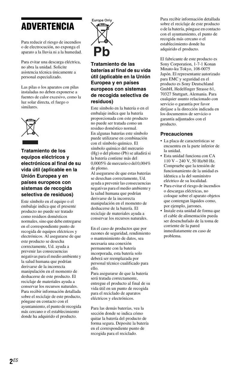 MAC-adres 25 MUTING 9 Para recibir información detallada sobre el reciclaje de este producto o de la batería, póngase en contacto con el ayuntamiento, el punto de recogida más cercano o el establecimiento donde ha adquirido el producto. ADVERTENCIA Para reducir el riesgo de incendios o de electrocución, no exponga el aparato a la lluvia ni a la humedad. Para evitar una descarga eléctrica, no abra la unidad. Solicite asistencia técnica únicamente a personal especializado. Las pilas o los aparatos con pilas instaladas no deben exponerse a fuentes de calor excesivo, como la luz solar directa, el fuego o similares. Tratamiento de los equipos eléctricos y electrónicos al final de su vida útil (aplicable en la Unión Europea y en países europeos con sistemas de recogida selectiva de residuos) Este símbolo en el equipo o el embalaje indica que el presente producto no puede ser tratado como residuos domésticos normales, sino que debe entregarse en el correspondiente punto de recogida de equipos eléctricos y electrónicos. Al asegurarse de que este producto se desecha correctamente, Ud. ayuda a prevenir las consecuencias negativas para el medio ambiente y la salud humana que podrían derivarse de la incorrecta manipulación en el momento de deshacerse de este producto. El reciclaje de materiales ayuda a conservar los recursos naturales. Para recibir información detallada sobre el reciclaje de este producto, póngase en contacto con el ayuntamiento, el punto de recogida más cercano o el establecimiento donde ha adquirido el producto. 2ES Tratamiento de las baterías al final de su vida útil (aplicable en la Unión Europea y en países europeos con sistemas de recogida selectiva de residuos) Este símbolo en la batería o en el embalaje indica que la batería proporcionada con este producto no puede ser tratada como un residuo doméstico normal. En algunas baterías este símbolo puede utilizarse en combinación con el símbolo químico. El símbolo químico del mercurio (Hg) o del plomo (Pb) se añadirá si la batería contiene más del 0,0005% de mercurio o del 0,004% de plomo. Al asegurarse de que estas baterías se desechan correctamente, Ud. ayuda a prevenir las consecuencias negativas para el medio ambiente y la salud humana que podrían derivarse de la incorrecta manipulación en el momento de deshacerse de la batería. El reciclaje de materiales ayuda a conservar los recursos naturales. En el caso de productos que por razones de seguridad, rendimiento o mantenimiento de datos, sea necesaria una conexión permanente con la batería incorporada, esta batería solo deberá ser reemplazada por personal técnico cualificado para ello. Para asegurarse de que la batería será tratada correctamente, entregue el producto al final de su vida útil en un punto de recogida para el reciclado de aparatos eléctricos y electrónicos. Para las demás baterías, vea la sección donde se indica cómo quitar la batería del producto de forma segura. Deposite la batería en el correspondiente punto de recogida para el reciclado. El fabricante de este producto es Sony Corporation, 1-7-1 Konan Minato-ku Tokyo, 108-0075 Japón. El representante autorizado para EMC y seguridad en el producto es Sony Deutschland GmbH, Hedelfinger Strasse 61, 70327 Stuttgart, Alemania. Para cualquier asunto relacionado con servicio o garantía por favor diríjase a la dirección indicada en los documentos de servicio o garantía adjuntados con el producto. Precauciones