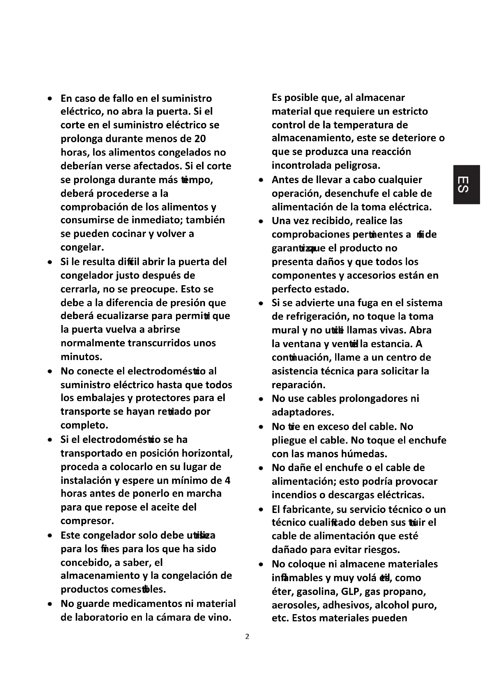 En caso de fallo en el suministro eléctrico, no abra la puerta. Si el corte en el suministro eléctrico se prolonga durante menos de 20 horas, los alimentos congelados no deberían verse afectados. Si el corte se prolonga durante más empo, deberá procederse a la comprobación de los alimentos y consumirse de inmediato; también se pueden cocinar y volver a congelar. Si le resulta di cil abrir la puerta del congelador justo después de cerrarla, no se preocupe. Esto se debe a la diferencia de presión que deberá ecualizarse para permi r que la puerta vuelva a abrirse normalmente transcurridos unos minutos. No conecte el electrodomés co al suministro eléctrico hasta que todos los embalajes y protectores para el transporte se hayan re rado por completo. Si el electrodomés co se ha transportado en posición horizontal, proceda a colocarlo en su lugar de instalación y espere un mínimo de 4 horas antes de ponerlo en marcha para que repose el aceite del compresor. Este congelador solo debe u rse para los nes para los que ha sido concebido, a saber, el almacenamiento y la congelación de productos comes bles. No guarde medicamentos ni material de laboratorio en la cámara de vino. Es posible que, al almacenar material que requiere un estricto control de la temperatura de almacenamiento, este se deteriore o que se produzca una reacción incontrolada peligrosa. Antes de llevar a cabo cualquier operación, desenchufe el cable de alimentación de la toma eléctrica. Una vez recibido, realice las comprobaciones per nentes a n de garan r que el producto no presenta daños y que todos los componentes y accesorios están en perfecto estado. Si se advierte una fuga en el sistema de refrigeración, no toque la toma mural y no u ce llamas vivas. Abra la ventana y ven e la estancia. A con nuación, llame a un centro de asistencia técnica para solicitar la reparación. No use cables prolongadores ni adaptadores. No re en exceso del cable. No pliegue el cable. No toque el enchufe con las manos húmedas. No dañe el enchufe o el cable de alimentación; esto podría provocar incendios o descargas eléctricas. El fabricante, su servicio técnico o un técnico cuali cado deben sus tuir el cable de alimentación que esté dañado para evitar riesgos. No coloque ni almacene materiales in amables y muy volá es, como éter, gasolina, GLP, gas propano, aerosoles, adhesivos, alcohol puro, etc. Estos materiales pueden3 provocar una explosión. No u ce ni almacene aerosoles in amables, como pintura en espray, cerca de la cámara de vino. Esto podría provocar explosiones o incendios. No coloque objetos ni contenedores con agua encima del aparato. No recomendamos el uso de cables prolongadores ni adaptadores con varias tomas. No arroje el electrodomés co al fuego. Tenga cuidado de no dañar las tuberías/el circuito de refrigeración del electrodomés co durante el transporte o el uso. En caso de daños, no exponga el electrodomés co al fuego, a una fuente de ignición potencial y ven e de inmediato la estancia donde se encuentre situado el electrodomés co. El sistema de refrigeración situado en la parte posterior e interior de la cámara de vino con ene refrigerante. Por lo tanto, evite dañar los tubos. No use disposi vos eléctricos dentro de los compar entos para alimentos del electrodomés co, salvo que sean del po recomendado por el fabricante. No dañe el circuito refrigerante. No u ce disposi vos mecánicos u otros equipos para acelerar el proceso de descongelación, salvo aquellos recomendados por el fabricante. No use disposi vos eléctricos dentro de los compar entos para alimentos, salvo que sean del po recomendado por el fabricante. Para evitar lesiones o quemaduras, no toque los elementos de refrigeración internos, sobre todo si ene las manos mojadas. No obstruya las aberturas de ven ción de la carcasa del electrodomés co o de la estructura integrada. No use objetos pun gudos o a lados como cuchillos o tenedores para eliminar la escarcha. No u ce secadores de pelo, estufas eléctricas u otros aparatos similares para descongelar. No u ce un cuchillo o cualquier objeto a do para eliminar escarcha o hielo. Si lo hace, el circuito refrigerante podría resultar dañado y las fugas podrían provocar incendios o daños oculares. No u ce disposi vos mecánicos u otros equipos para acelerar el proceso de descongelación. Evite absolutamente el uso de llamas descubiertas o equipos eléctricos para acelerar la fase de descongelación, tales como calefactores, limpiadores de vapor, velas, lámparas de aceite y similares. Nunca realice un lavado con agua del compresor, simplemente pase un paño seco para evitar el óxido tras la limpieza. Se recomienda mantener el enchufe limpio; cualquier exceso de polvo sobre el enchufe podría provocar un4 incendio. Este producto está diseñado y construido únicamente para usos domés cos. La garan quedará sin validez si el producto se instala o u en lugares comerciales o no residenciales. El producto debe instalarse, ubicarse y manejarse correctamente, de acuerdo con las instrucciones contenidas en el Manual de instrucciones del usuario suministrado. La garan se aplica solo a productos nuevos y no es transferible si se revende el producto. Nuestra empresa declina toda responsabilidad en caso de datos incidentales o emergentes. La garan no afectará, en ningún caso, a sus derechos legales. No lleve a cabo reparaciones en la cámara de vino. Todas las intervenciones debe llevarlas a cabo únicamente personal cuali cado. Si va a eliminar un producto an guo con un cerrojo o un pasador instalado en la puerta, asegúrese de depositarlo en condiciones seguras que eviten que queden niños atrapados en su interior. Este electrodomés co puede ser u do por niños de 8 años o más y por personas con capacidades sicas, sensoriales o mentales reducidas o con falta de experiencia y conocimiento, siempre y cuando estén supervisados o hayan recibido instrucciones adecuadas ac