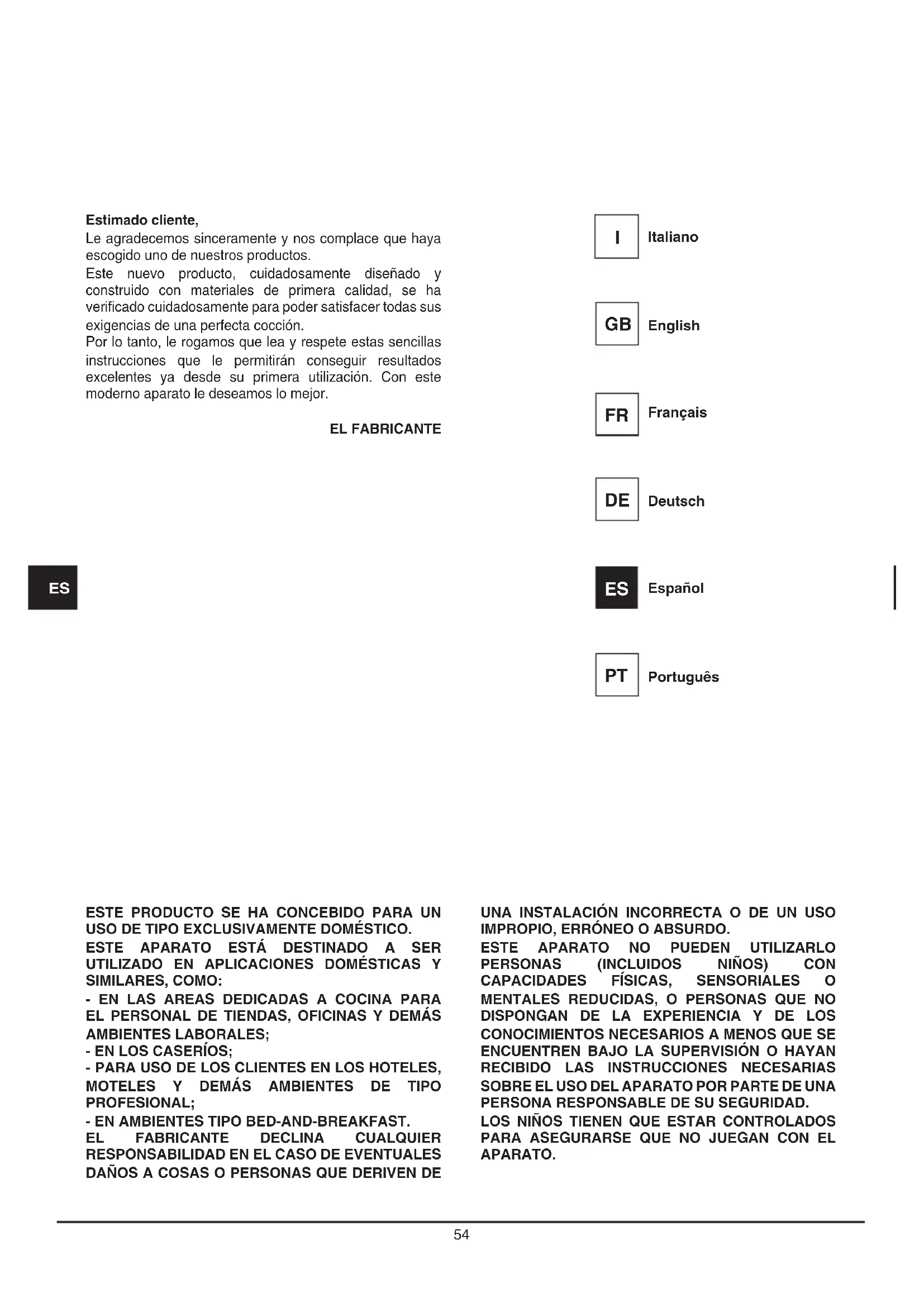 SOBRE EL USO DEL APARATO POR PARTE DE UNA PERSONA RESPONSABLE DE SU SEGURIDAD. LOS NIÑOS TIENEN QUE ESTAR CONTROLADOS PARA ASEGURARSE QUE NO JUEGAN CON EL APARATO. Estimado cliente, Le agradecemos sinceramente y nos complace que haya escogido uno de nuestros productos. Este nuevo producto, cuidadosamente diseñado y construido con materiales de primera calidad, se ha verificado cuidadosamente para poder satisfacer todas sus exigencias de una perfecta cocción. Por lo tanto, le rogamos que lea y respete estas sencillas instrucciones que le permitirán conseguir resultados excelentes ya desde su primera utilización. Con este moderno aparato le deseamos lo mejor. EL FABRICANTE Italiano