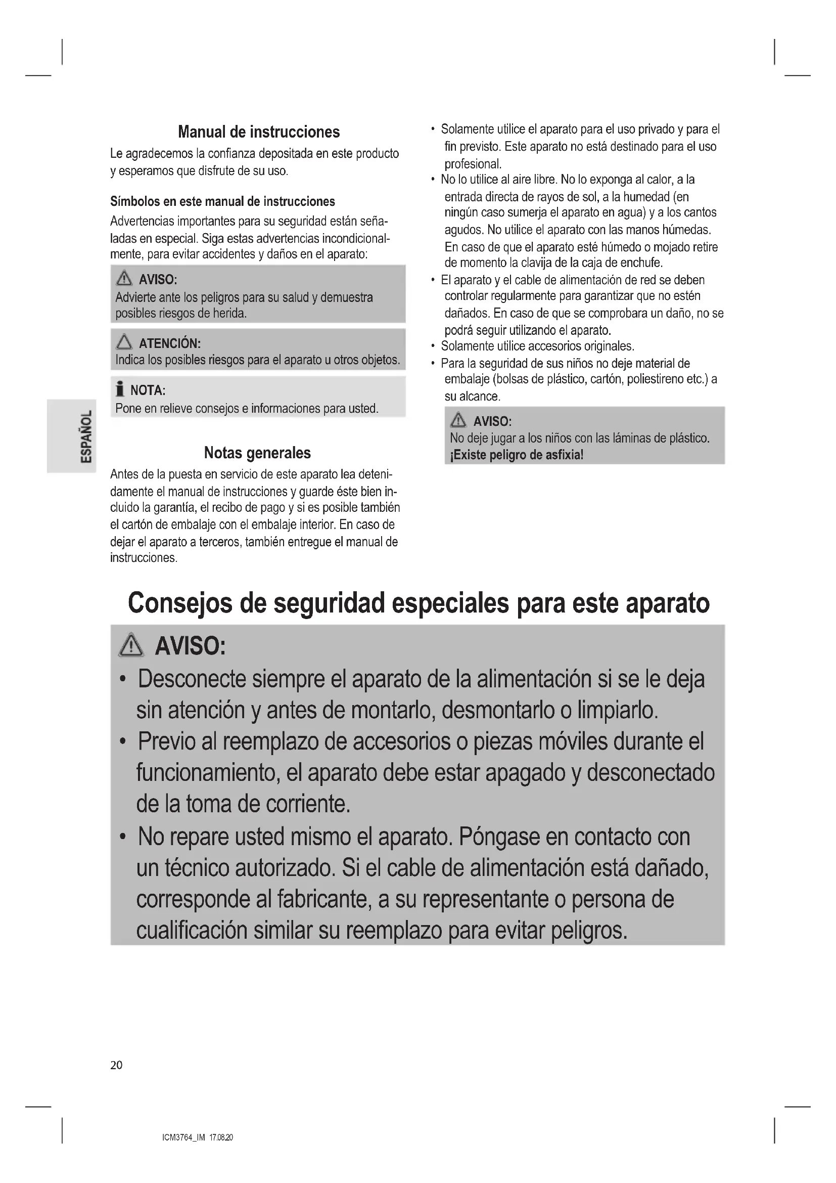 daños, no use el aparato. Devuélvalo de inmediato al vendedor. NOTA: Puede haber polvo y residuos de la fabricación del aparato. Recomendamos la limpieza del aparato según lo descrito en la sección “Limpieza”.ICM3764_IM 17.08.20