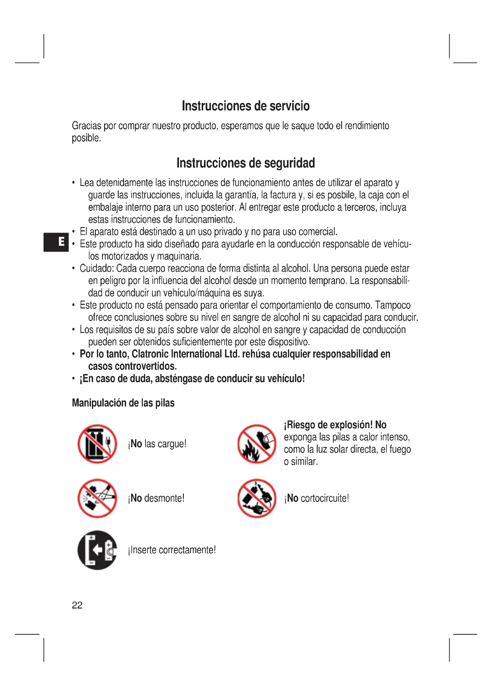 - ¡En caso de duda, absténgase de conducir su vehículo! Manipulación de las pilas ¡No las cargue! ¡Riesgo de explosión! No exponga las pilas a calor intenso, como la luz solar directa, el fuego o similar. ¡No desmonte! ¡No cortocircuite! ¡Inserte correctamente!23