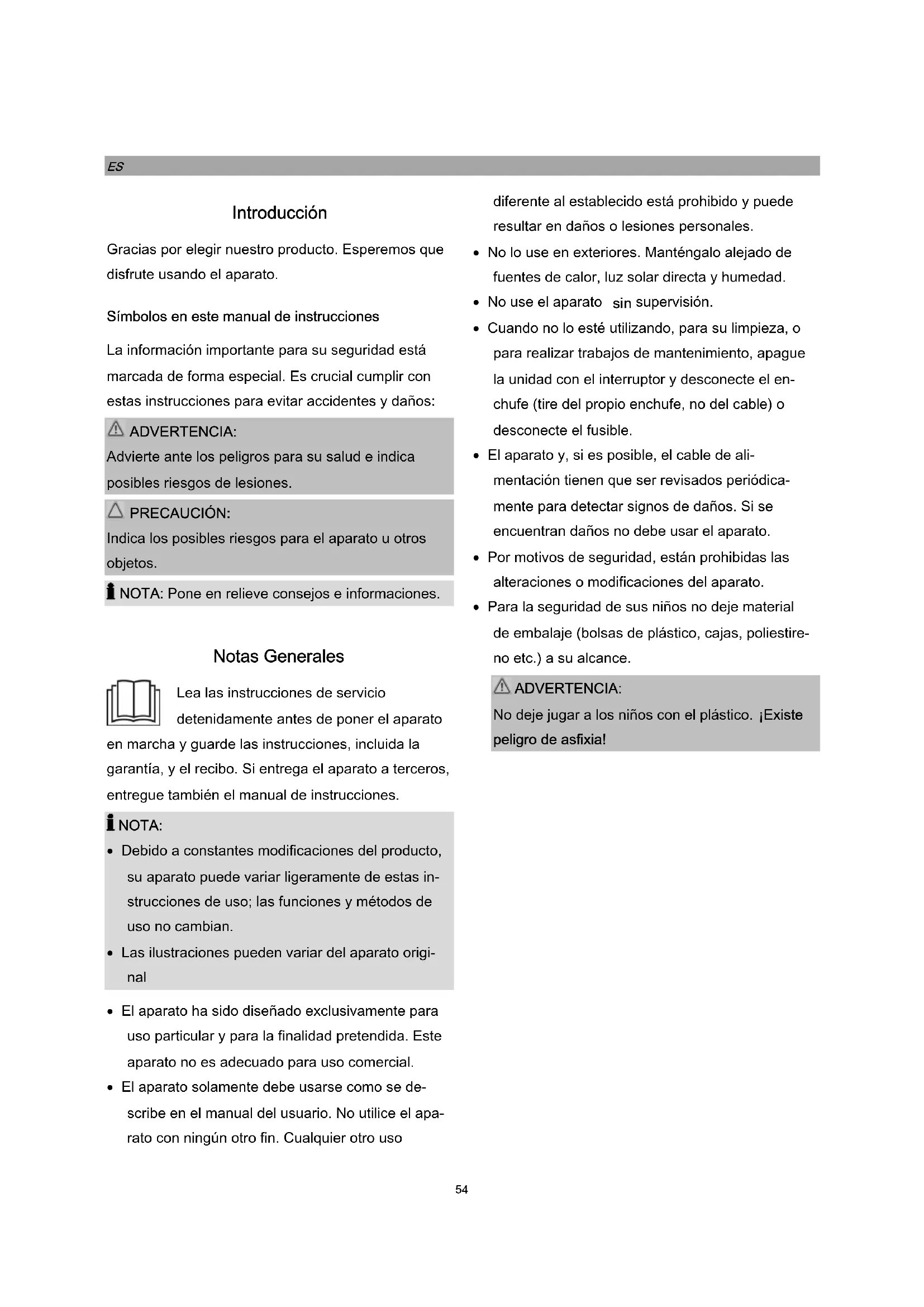 NOTA: Debido a constantes modificaciones del producto, su aparato puede variar ligeramente de estas in- strucciones de uso; las funciones y métodos de uso no cambian. Las ilustraciones pueden variar del aparato origi- nal El aparato ha sido diseñado exclusivamente para uso particular y para la finalidad pretendida. Este aparato no es adecuado para uso comercial. El aparato solamente debe usarse como se de- scribe en el manual del usuario. No utilice el apa- rato con ningún otro fin. Cualquier otro uso diferente al establecido está prohibido y puede resultar en daños o lesiones personales. No lo use en exteriores. Manténgalo alejado de fuentes de calor, luz solar directa y humedad. No use el aparato sin supervisión. Cuando no lo esté utilizando, para su limpieza, o para realizar trabajos de mantenimiento, apague la unidad con el interruptor y desconecte el en- chufe (tire del propio enchufe, no del cable) o desconecte el fusible. El aparato y, si es posible, el cable de ali- mentación tienen que ser revisados periódica- mente para detectar signos de daños. Si se encuentran daños no debe usar el aparato. Por motivos de seguridad, están prohibidas las alteraciones o modificaciones del aparato. Para la seguridad de sus niños no deje material de embalaje (bolsas de plástico, cajas, poliestire- no etc.) a su alcance. ADVERTENCIA: No deje jugar a los niños con el plástico. ¡Existe peligro de asfixia!55