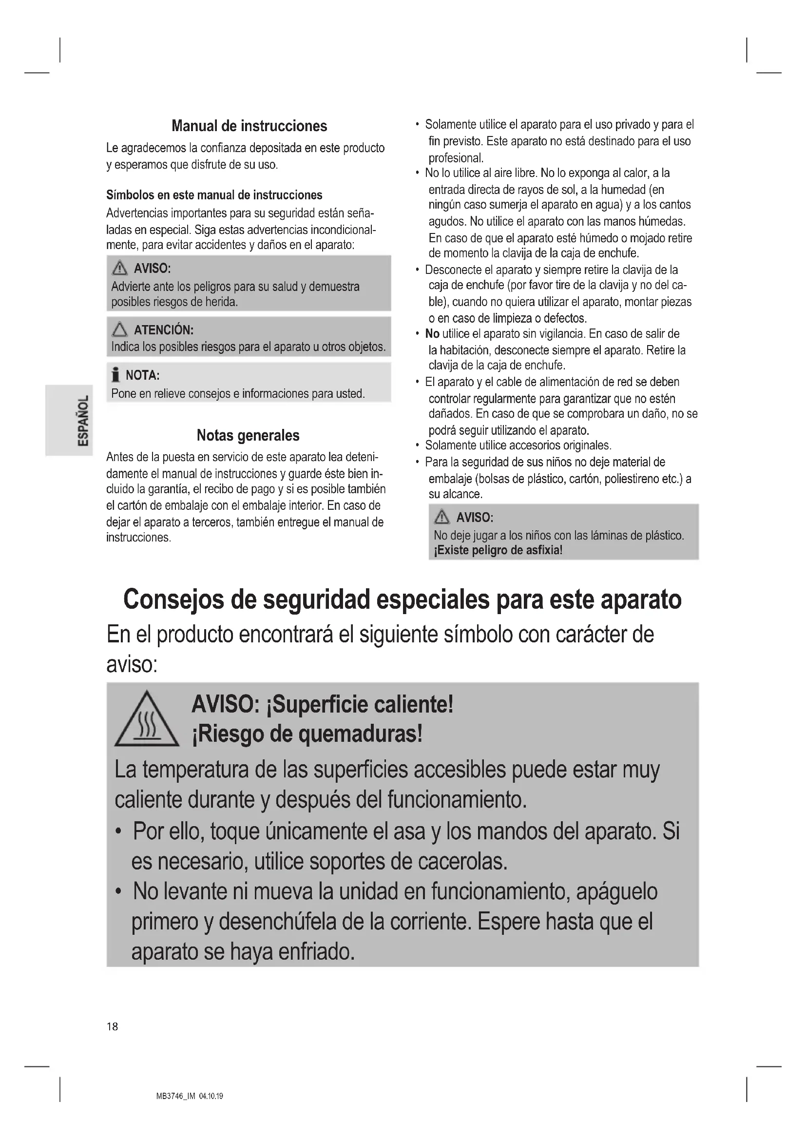 Datos técnicos Modelo: .................................................................... MB 3746 Suministro de tensión: .......................220 - 240 V~, 50 - 60 Hz Consumo de energía: ...................................................650 W Clase de protección: .............................................................. Peso neto: .......................................................... aprox. 3,0 kg El derecho de realizar modicaciones técnicas y de diseño en el curso del desarrollo continuo del producto esta reservado. Este dispositivo cumple con todas las directrices CE actua- les, como la directriz de compatibilidad electromagnética y de bajo voltaje, y está fabricada según las últimas normas de seguridad. Eliminación Signicado del símbolo “Cubo de basura” Proteja nuestro medio ambiente, aparatos eléc- tricos no forman parte de la basura doméstica. Haga uso de los centros de recogida previstos para la eliminación de aparatos eléctricos y entregue allí sus aparatos eléctricos que no vaya a utilizar más. Ayudará en evitar las potenciales consecuencias, a causa de una errónea eliminación de desechos, para el medio ambiente y la salud humana. Con ello, contribuirá a la recuperación, al reciclado y a otras formas de reutilización de los aparatos viejos eléctricos y electrónicos. La información cómo se debe eliminar los aparatos, se obtiene en su ayuntamiento o su administración municipal.MB3746_IM 04.10.19
