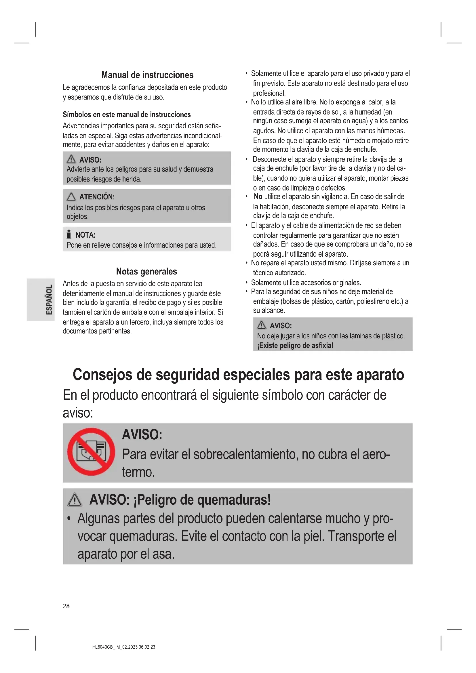 - Pueden utilizar este aparato niños mayores de 8 años y personas con minusvalías físicas, sensoriales o mentales, o sin experienciaHL6040CB_IM_02.2023 06.02.23