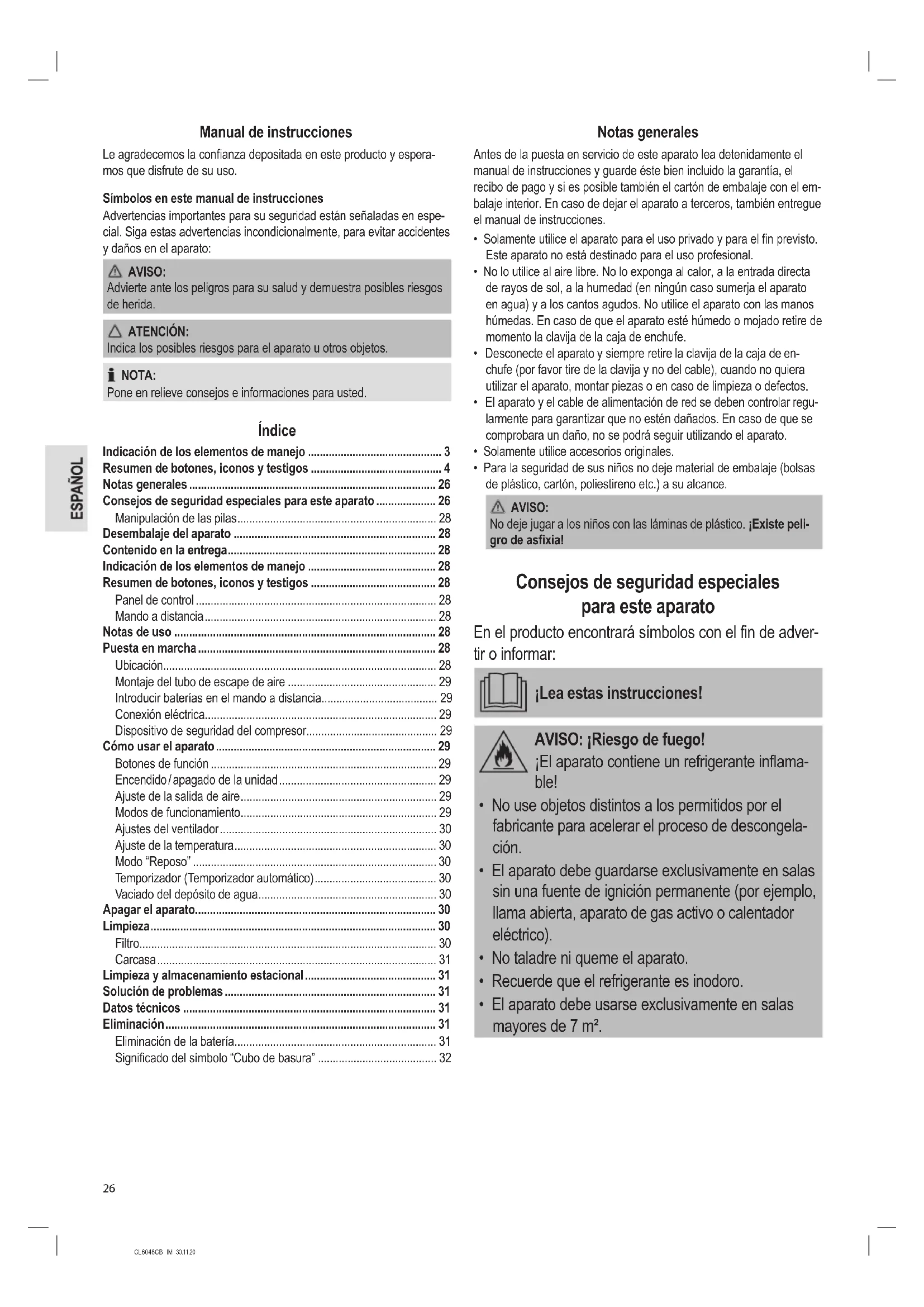 lugar seco y bien ventilado. Solución de problemas Problema Posibles causas Solución La unidad no funciona. No hay suministro eléctrico. Compruebe la conexión eléctrica. La temperatura ambiente es demasiado baja o demasiado alta. Se recomienda utilizar el aparato a una temperatura am- biente entre 7 - 35 °C (44 - 95 °F). El aparato está defectuoso. Póngase en contacto con nuestro departamento de aten- ción al cliente o con un especialista. Tenga en cuenta el manual de servicio adjunto. La unidad no enfría lo suciente. La unidad está expuesta a la luz solar directa. Seleccione otra ubicación o baje las persianas. Las ventanas o puertas están abiertas. Cierre todas las ventanas o puertas. Hay demasiada gente u otras fuentes de calor en la habitación. Retire los calefactores portátiles o desconéctelos. El ltro está sucio. Limpie el ltro. La entrada de aire o la salida de aire están bloqueadas. Elimine el bloqueo. Mantenga las aberturas de ventilación sin obstrucciones. La unidad mete demasido ruido durante el funcionamiento. La unidad no está en posición vertical. Coloque la unidad sobre una supercie plana. Evite las vibraciones. El aparato se apaga durante el funcionamiento. El testigo indicador FULL se enciende rojo. El depósito de agua está lleno. Desenchufe de la corriente. Vacíe el depósito de agua con la salida de agua inferior. A continuación podrá usar de nuevo el aparato. El mando a distancia no funciona. El aparato está demasiado lejos. Acérquese al aparato. El mando a distancia no apunta hacia el sensor. Coloque el mando de forma que apunte al sensor. Compruebe si hay obstáculos entre el mando a distancia y el sensor. Las pilas están gastadas. Cambie las pilas. Pantalla del aparato: Sensor de temperatura defectuoso. Póngase en contacto con nuestro servicio de atención al cliente o su proveedor. Pantalla del aparato: Contacte con nuestro servicio al cliente o su vendedor si encuentra cualquier problema que no se encuentre en la tabla o si la solución recomendada no funciona. Datos técnicos Modelo: ...................................................................................CL 6048 CB Peso neto: ............................................................................aprox. 19,7 kg Suministro de tensión: .................................................220 - 240 V~, 50 Hz Consumo de energía: ...................................................................... 792 W Clase de protección: ................................................................................. Clase de eciencia energética: ................................................................A Capacidad de refrigeración: .......................................7000 BTU (2,06 kW) Refrigerante: ..................................................................................... R 290 Presión de trabajo máxima permisible: Lado de presión: ....................................................................... 1,8 MPa Lado de succión: ...................................................................... 0,6 MPa Máxima presión permitida: ............................................................ 3,0 MPa El derecho de realizar modicaciones técnicas y de diseño en el curso del desarrollo continuo del producto esta reservado. Este dispositivo cumple con todas las directrices CE actuales, como la directriz de compatibilidad electromagnética y de bajo voltaje, y está fabricada según las últimas normas de seguridad. Eliminación Eliminación de la batería Como consumidor está obligado por la ley a recoger pi- las / acumuladores gastados. Retire las pilas del mando a distancia antes de desechar el aparato.CL6048CB_IM 30.11.20
