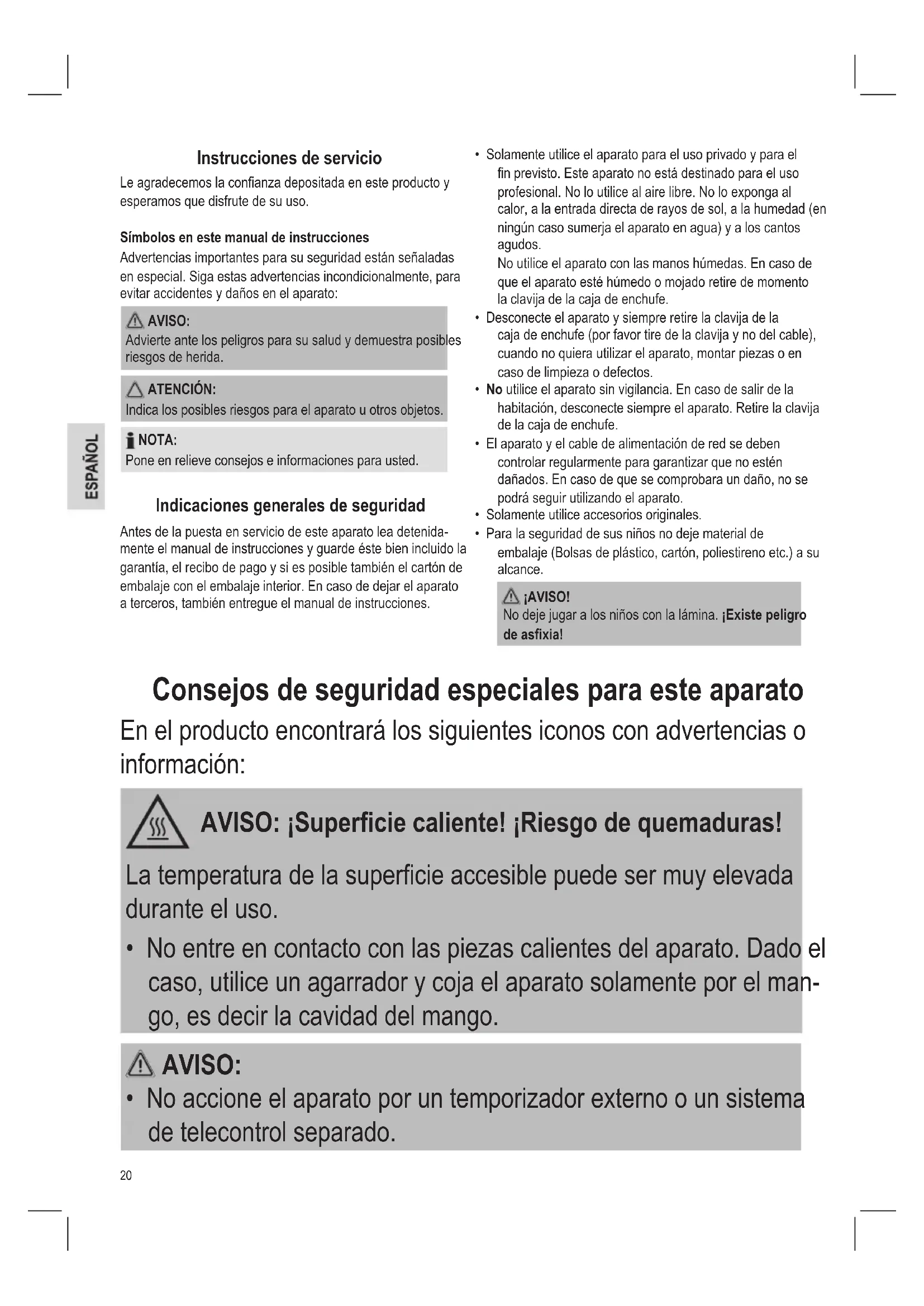 - Para la seguridad de sus niños no deje material de embalaje (Bolsas de plástico, cartón, poliestireno etc.) a su alcance. ¡AVISO! No deje jugar a los niños con la lámina. ¡Existe peligro de asfixia! Consejos de seguridad especiales para este aparato En el producto encontrará los siguientes iconos con advertencias o información: AVISO: ¡Superficie caliente! ¡Riesgo de quemaduras! La temperatura de la supercie accesible puede ser muy elevada durante el uso.