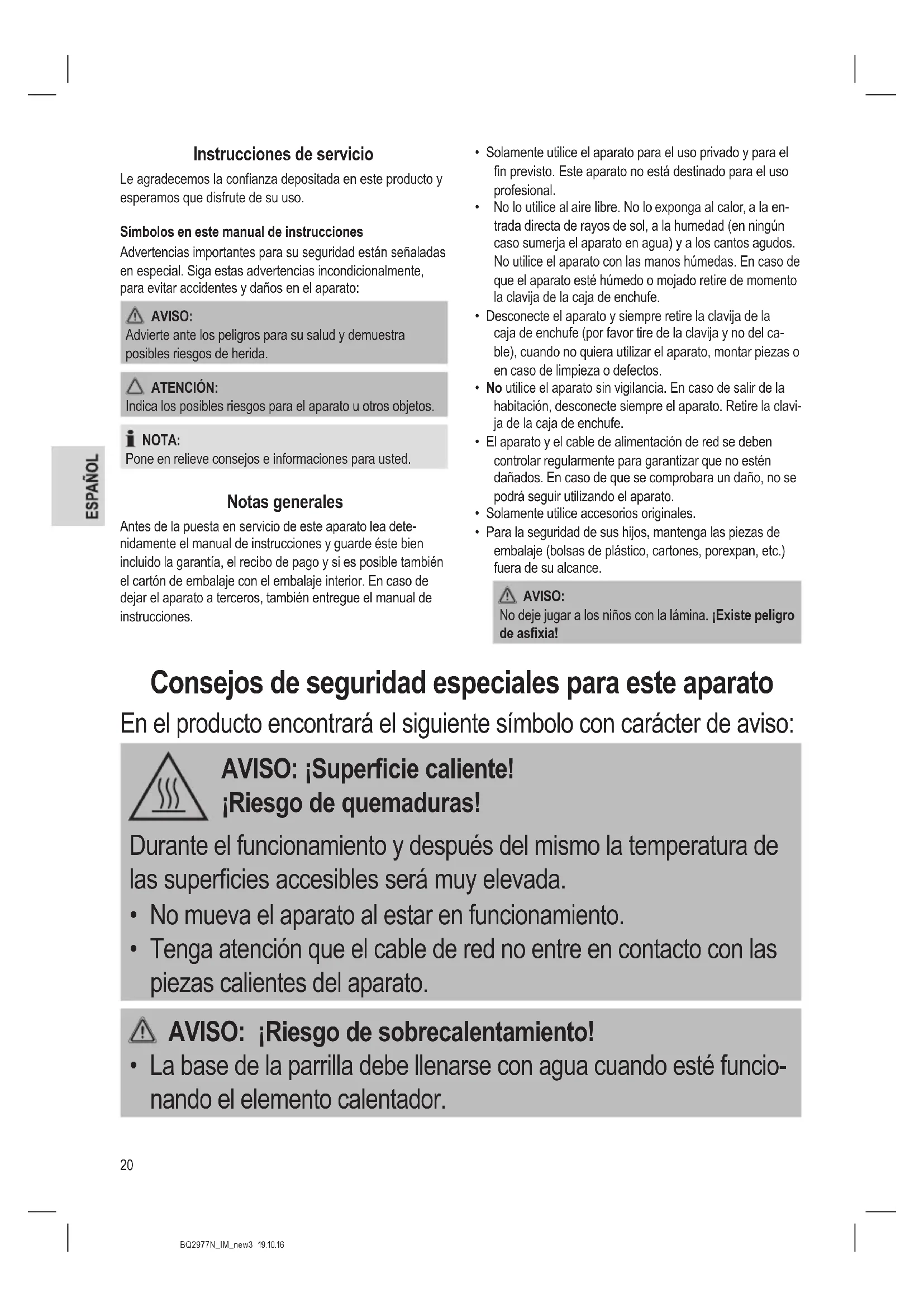 - La base de la parrilla debe llenarse con agua cuando esté funcio- nando el elemento calentador.21 BQ2977N_IM_new3 19.10.16 AVISO: ¡Riesgo de sobrecalentamiento!