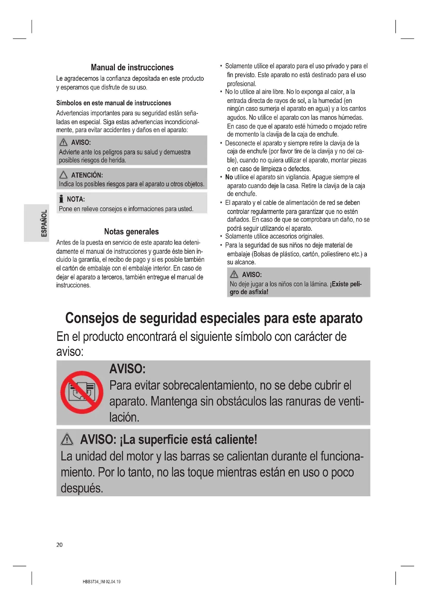 - Para la seguridad de sus niños no deje material de embalaje (Bolsas de plástico, cartón, poliestireno etc.) a su alcance. AVISO: No deje jugar a los niños con la lámina. ¡Existe peli- gro de asxia! Consejos de seguridad especiales para este aparato En el producto encontrará el siguiente símbolo con carácter de aviso: AVISO: Para evitar sobrecalentamiento, no se debe cubrir el aparato. Mantenga sin obstáculos las ranuras de venti- lación. AVISO: ¡La supercie está caliente! La unidad del motor y las barras se calientan durante el funciona- miento. Por lo tanto, no las toque mientras están en uso o poco después.HBB3734_IM 02.04.19