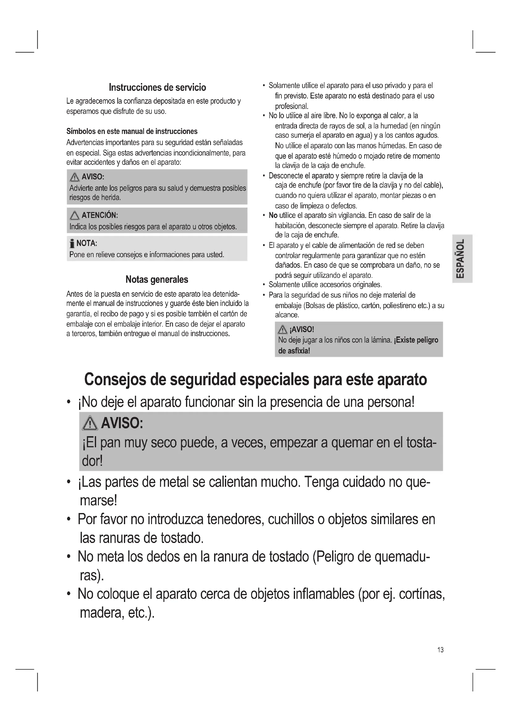 - ¡No deje el aparato funcionar sin la presencia de una persona! AVISO: ¡El pan muy seco puede, a veces, empezar a quemar en el tosta- dor!