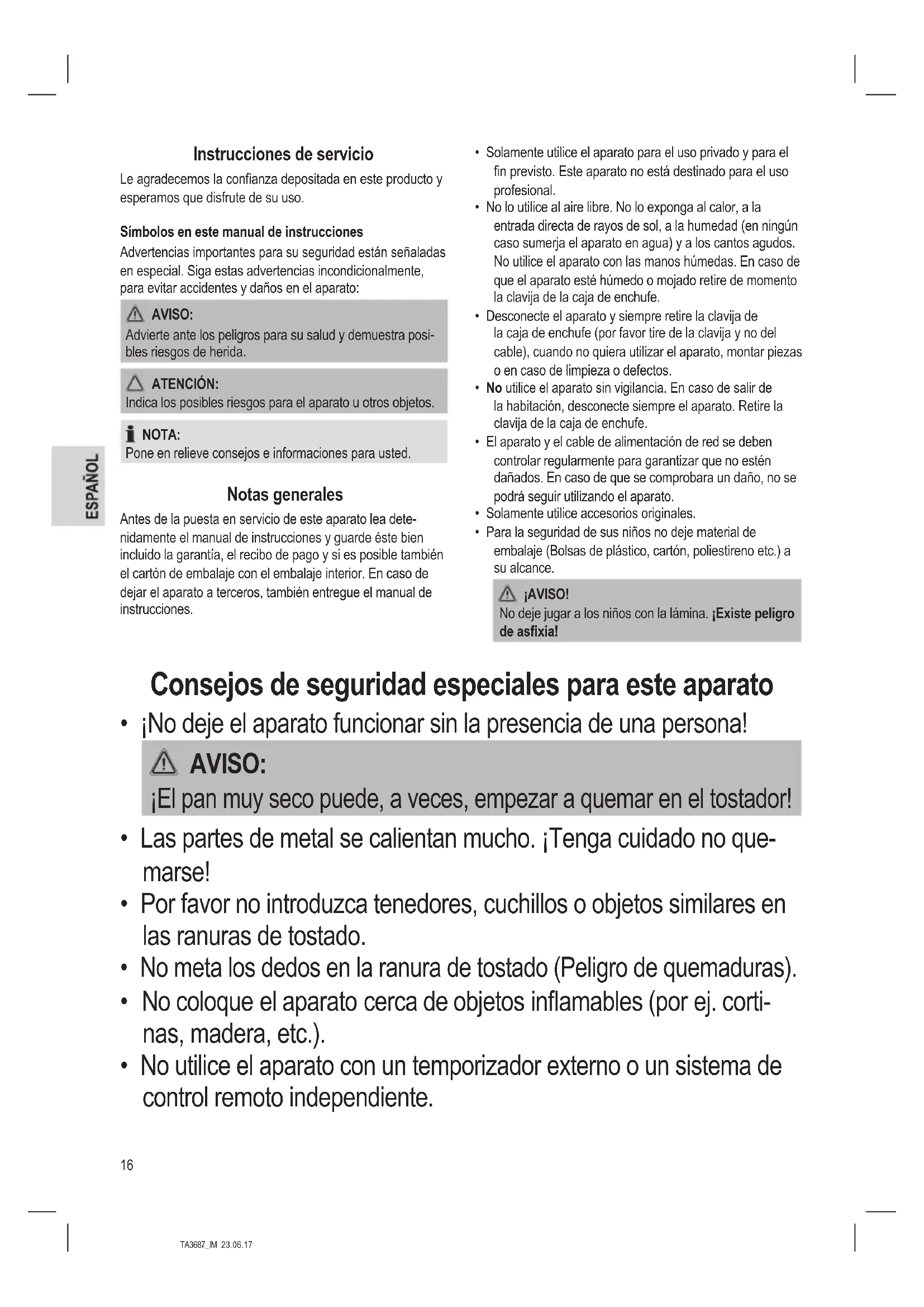 - Extraiga el cajón de migas por la empuñadura, retire los restos de pan e introduzca de nuevo el cajón. Resolución de problemas Problema Posible causa Solución El aparato no funciona. El aparato no recibe suministro eléctrico. Pruebe la toma con otro aparato. Enchufe el cable correctamente. Compruebe el disruptor de circuito principal. El aparato está defectuoso. Póngase en contacto con nuestro centro de servicios o con un especialista. El pan está demasiado tostado. La conguración de potencia del tostador es dema- siado elevada. Seleccione una conguración de potencia inferior. El pan está poco tostado. La conguración de potencia del tostador es demasiado baja. Seleccione una con- guración de potencia superior. Las ranuras para tostadas no se elevan. Hay una rebanada de pan atrapada en la ranura. Desconecte el enchufe de la toma. Deje que se enfríe el aparato. Libere la rebanada de pan con un objeto ais- lado como, por ejemplo, un palillo de madera. Si es necesario, dé la vuelta al tostador para que la rebanada de pan caiga. Datos técnicos Modelo: ........................................................................TA 3687 Suministro de tensión: ......................... 220 - 240 V~, 50 / 60 Hz Consumo de energía: .........................................máx. 1900 W Clase de protección: ............................................................... Peso neto: ..........................................................aprox. 1,58 kg El derecho de realizar modicaciones técnicas y de diseño en el curso del desarrollo continuo del producto está reser- vado. Este aparato se ha examinado según las normativas actuales y vigentes de la Comunidad Europea, como p. ej. compatibilidad electromagnética y directiva de baja tensión y se ha construido según las más nuevas especicaciones en razón de la seguridad. Eliminación Signicado del símbolo “Cubo de basura” Proteja nuestro medio ambiente, aparatos eléc- tricos no forman parte de la basura doméstica. Haga uso de los centros de recogida previstos para la eliminación de aparatos eléctricos y en- tregue allí sus aparatos eléctricos que no vaya a utilizar más. Ayudará en evitar las potenciales consecuencias, a causa de una errónea eliminación de desechos, para el medio ambiente y la salud humana. Con ello, contribuirá a la recuperación, al reciclado y a otras formas de reutilización de los aparatos viejos eléctricos y electrónicos. La información cómo se debe eliminar los aparatos, se ob- tiene en su ayuntamiento o su administración municipal.20 TA3687_IM 23.06.17 Istruzioni per l’uso Grazie per aver scelto il nostro prodotto. Vi auguriamo un buon utilizzo del dispositivo. Simboli per questo manuale di istruzioni per l’uso Le indicazioni importanti per la propria sicurezza sono indicati appropriatamente. Osservare assolutamente queste indica- zioni, per evitare incidenti e danni all’apparecchio: AVVISO: Previene i rischi della propria salute ed indica possibili rischi di ferite. ATTENZIONE: Indica possibili pericoli per l’apparecchio o altri oggetti. NOTA: Mette in risalto consigli ed informazioni. Note generali Prima di mettere in funzione questo apparecchio, leggere molto attentamente le istruzioni per l’uso e conservarle con cura unitamente al certificato di garanzia, allo scontrino e, se possibile, alla scatola di cartone con la confezione interna. Se passate l‘apparecchio a terzi, consegnate anche le istruzioni per l‘uso.