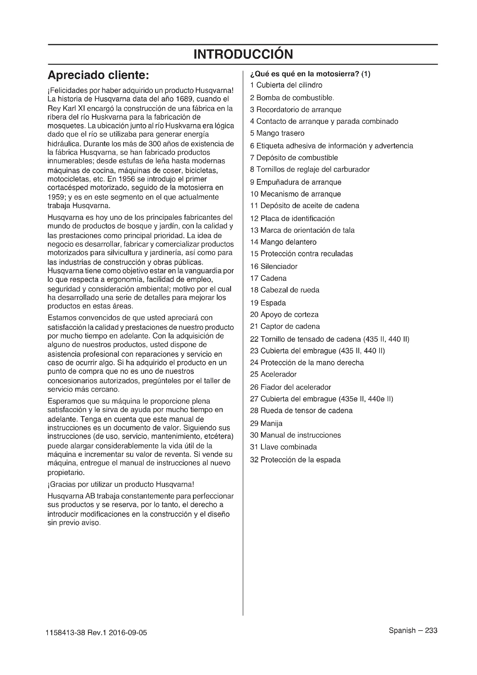 - Declaración CE de conformidad INTRODUCCIÓN Spanish – 233 1158413-38 Rev.1 2016-09-05 Apreciado cliente: ¡Felicidades por haber adquirido un producto Husqvarna! La historia de Husqvarna data del año 1689, cuando el Rey Karl XI encargó la construcción de una fábrica en la ribera del río Huskvarna para la fabricación de mosquetes. La ubicación junto al río Huskvarna era lógica dado que el río se utilizaba para generar energía hidráulica. Durante los más de 300 años de existencia de la fábrica Husqvarna, se han fabricado productos innumerables; desde estufas de leña hasta modernas máquinas de cocina, máquinas de coser, bicicletas, motocicletas, etc. En 1956 se introdujo el primer cortacésped motorizado, seguido de la motosierra en 1959; y es en este segmento en el que actualmente trabaja Husqvarna. Husqvarna es hoy uno de los principales fabricantes del mundo de productos de bosque y jardín, con la calidad y las prestaciones como principal prioridad. La idea de negocio es desarrollar, fabricar y comercializar productos motorizados para silvicultura y jardinería, así como para las industrias de construcción y obras públicas. Husqvarna tiene como objetivo estar en la vanguardia por lo que respecta a ergonomía, facilidad de empleo, seguridad y consideración ambiental; motivo por el cual ha desarrollado una serie de detalles para mejorar los productos en estas áreas. Estamos convencidos de que usted apreciará con satisfacción la calidad y prestaciones de nuestro producto por mucho tiempo en adelante. Con la adquisición de alguno de nuestros productos, usted dispone de asistencia profesional con reparaciones y servicio en caso de ocurrir algo. Si ha adquirido el producto en un punto de compra que no es uno de nuestros concesionarios autorizados, pregúnteles por el taller de servicio más cercano. Esperamos que su máquina le proporcione plena satisfacción y le sirva de ayuda por mucho tiempo en adelante. Tenga en cuenta que este manual de instrucciones es un documento de valor. Siguiendo sus instrucciones (de uso, servicio, mantenimiento, etcétera) puede alargar considerablemente la vida útil de la máquina e incrementar su valor de reventa. Si vende su máquina, entregue el manual de instrucciones al nuevo propietario. ¡Gracias por utilizar un producto Husqvarna! Husqvarna AB trabaja constantemente para perfeccionar sus productos y se reserva, por lo tanto, el derecho a introducir modificaciones en la construcción y el diseño sin previo aviso. ¿Qué es qué en la motosierra? (1) 1 Cubierta del cilindro 2 Bomba de combustible. 3 Recordatorio de arranque 4 Contacto de arranque y parada combinado 5 Mango trasero 6 Etiqueta adhesiva de información y advertencia 7 Depósito de combustible 8 Tornillos de reglaje del carburador 9 Empuñadura de arranque 10 Mecanismo de arranque 11 Depósito de aceite de cadena 12 Placa de identificación 13 Marca de orientación de tala 14 Mango delantero 15 Protección contra reculadas 16 Silenciador 17 Cadena 18 Cabezal de rueda 19 Espada 20 Apoyo de corteza 21 Captor de cadena 22 Tornillo de tensado de cadena (435 II, 440 II) 23 Cubierta del embrague (435 II, 440 II) 24 Protección de la mano derecha 25 Acelerador 26 Fiador del acelerador 27 Cubierta del embrague (435e II, 440e II) 28 Rueda de tensor de cadena 29 Manija 30 Manual de instrucciones 31 Llave combinada 32 Protección de la espadaINSTRUCCIONES GENERALES DE SEGURIDAD 234 – Spanish 1158413-38 Rev.1 2016-09-05 Medidas a tomar antes de utilizar una motosierra nueva p. 259