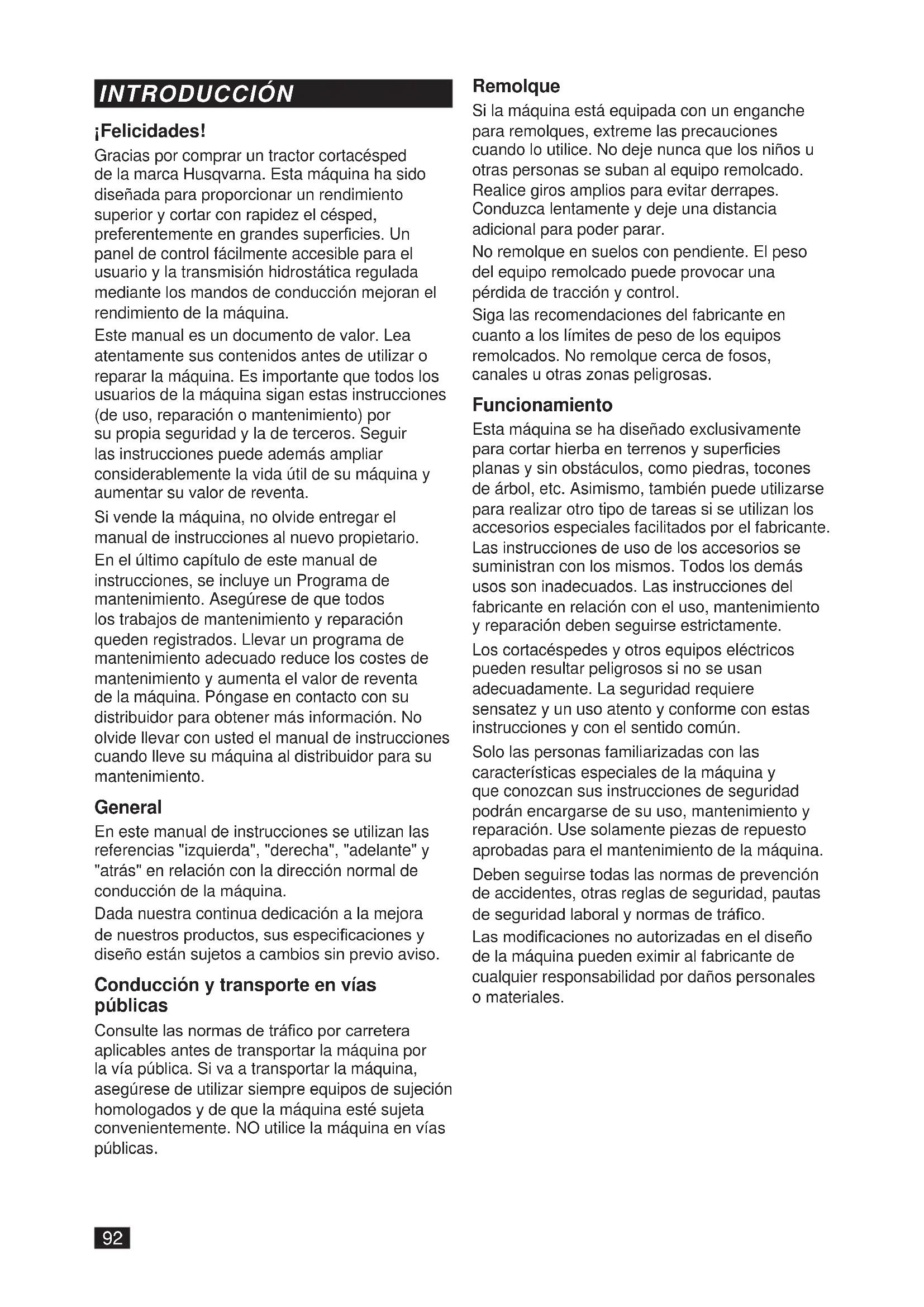 PROGRAMA DE MANTENIMIENTO ............ 132¡Felicidades! Gracias por comprar un tractor cortacésped de la marca Husqvarna. Esta máquina ha sido diseñada para proporcionar un rendimiento superior y cortar con rapidez el césped, preferentemente en grandes supercies. Un panel de control fácilmente accesible para el usuario y la transmisión hidrostática regulada mediante los mandos de conducción mejoran el rendimiento de la máquina. Este manual es un documento de valor. Lea atentamente sus contenidos antes de utilizar o reparar la máquina. Es importante que todos los usuarios de la máquina sigan estas instrucciones (de uso, reparación o mantenimiento) por su propia seguridad y la de terceros. Seguir las instrucciones puede además ampliar considerablemente la vida útil de su máquina y aumentar su valor de reventa. Si vende la máquina, no olvide entregar el manual de instrucciones al nuevo propietario. En el último capítulo de este manual de instrucciones, se incluye un Programa de mantenimiento. Asegúrese de que todos los trabajos de mantenimiento y reparación queden registrados. Llevar un programa de mantenimiento adecuado reduce los costes de mantenimiento y aumenta el valor de reventa de la máquina. Póngase en contacto con su distribuidor para obtener más información. No olvide llevar con usted el manual de instrucciones cuando lleve su máquina al distribuidor para su mantenimiento. General En este manual de instrucciones se utilizan las referencias "izquierda", "derecha", "adelante" y "atrás" en relación con la dirección normal de conducción de la máquina. Dada nuestra continua dedicación a la mejora de nuestros productos, sus especicaciones y diseño están sujetos a cambios sin previo aviso. Conducción y transporte en vías públicas Consulte las normas de tráco por carretera aplicables antes de transportar la máquina por la vía pública. Si va a transportar la máquina, asegúrese de utilizar siempre equipos de sujeción homologados y de que la máquina esté sujeta convenientemente. NO utilice la máquina en vías públicas. Remolque Si la máquina está equipada con un enganche para remolques, extreme las precauciones cuando lo utilice. No deje nunca que los niños u otras personas se suban al equipo remolcado. Realice giros amplios para evitar derrapes. Conduzca lentamente y deje una distancia adicional para poder parar. No remolque en suelos con pendiente. El peso del equipo remolcado puede provocar una pérdida de tracción y control. Siga las recomendaciones del fabricante en cuanto a los límites de peso de los equipos remolcados. No remolque cerca de fosos, canales u otras zonas peligrosas. Funcionamiento Esta máquina se ha diseñado exclusivamente para cortar hierba en terrenos y supercies planas y sin obstáculos, como piedras, tocones de árbol, etc. Asimismo, también puede utilizarse para realizar otro tipo de tareas si se utilizan los accesorios especiales facilitados por el fabricante. Las instrucciones de uso de los accesorios se suministran con los mismos. Todos los demás usos son inadecuados. Las instrucciones del fabricante en relación con el uso, mantenimiento y reparación deben seguirse estrictamente. Los cortacéspedes y otros equipos eléctricos pueden resultar peligrosos si no se usan adecuadamente. La seguridad requiere sensatez y un uso atento y conforme con estas instrucciones y con el sentido común. Solo las personas familiarizadas con las características especiales de la máquina y que conozcan sus instrucciones de seguridad podrán encargarse de su uso, mantenimiento y reparación. Use solamente piezas de repuesto aprobadas para el mantenimiento de la máquina. Deben seguirse todas las normas de prevención de accidentes, otras reglas de seguridad, pautas de seguridad laboral y normas de tráco. Las modicaciones no autorizadas en el diseño de la máquina pueden eximir al fabricante de cualquier responsabilidad por daños personales o materiales.