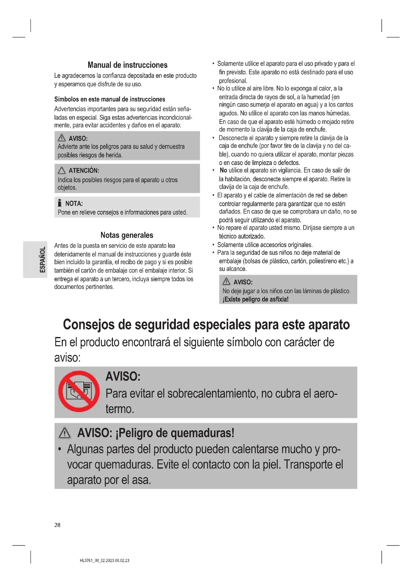 - Guarde siempre el aparato fuera del alcance de los niños, en un lugar seco y bien ventilado.HL3761_IM_02.2023 06.02.23