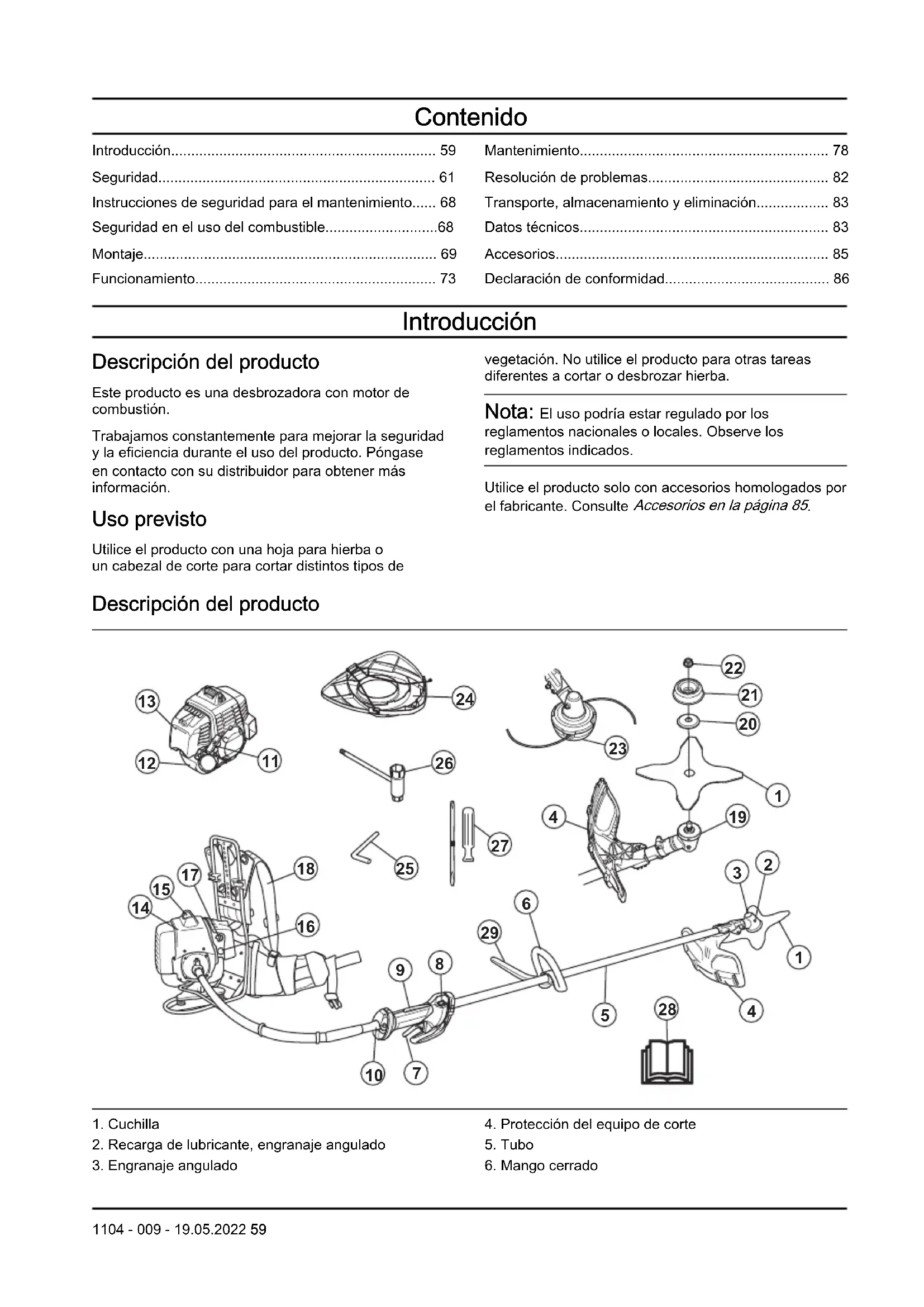 - Declaración de conformidad Introducción Descripción del producto Este producto es una desbrozadora con motor de combustión. Trabajamos constantemente para mejorar la seguridad y la eficiencia durante el uso del producto. Póngase en contacto con su distribuidor para obtener más información. Uso previsto Utilice el producto con una hoja para hierba o un cabezal de corte para cortar distintos tipos de vegetación. No utilice el producto para otras tareas diferentes a cortar o desbrozar hierba. Nota: El uso podría estar regulado por los reglamentos nacionales o locales. Observe los reglamentos indicados. Utilice el producto solo con accesorios homologados por el fabricante. Consulte Accesorios en la página 85 p. 86