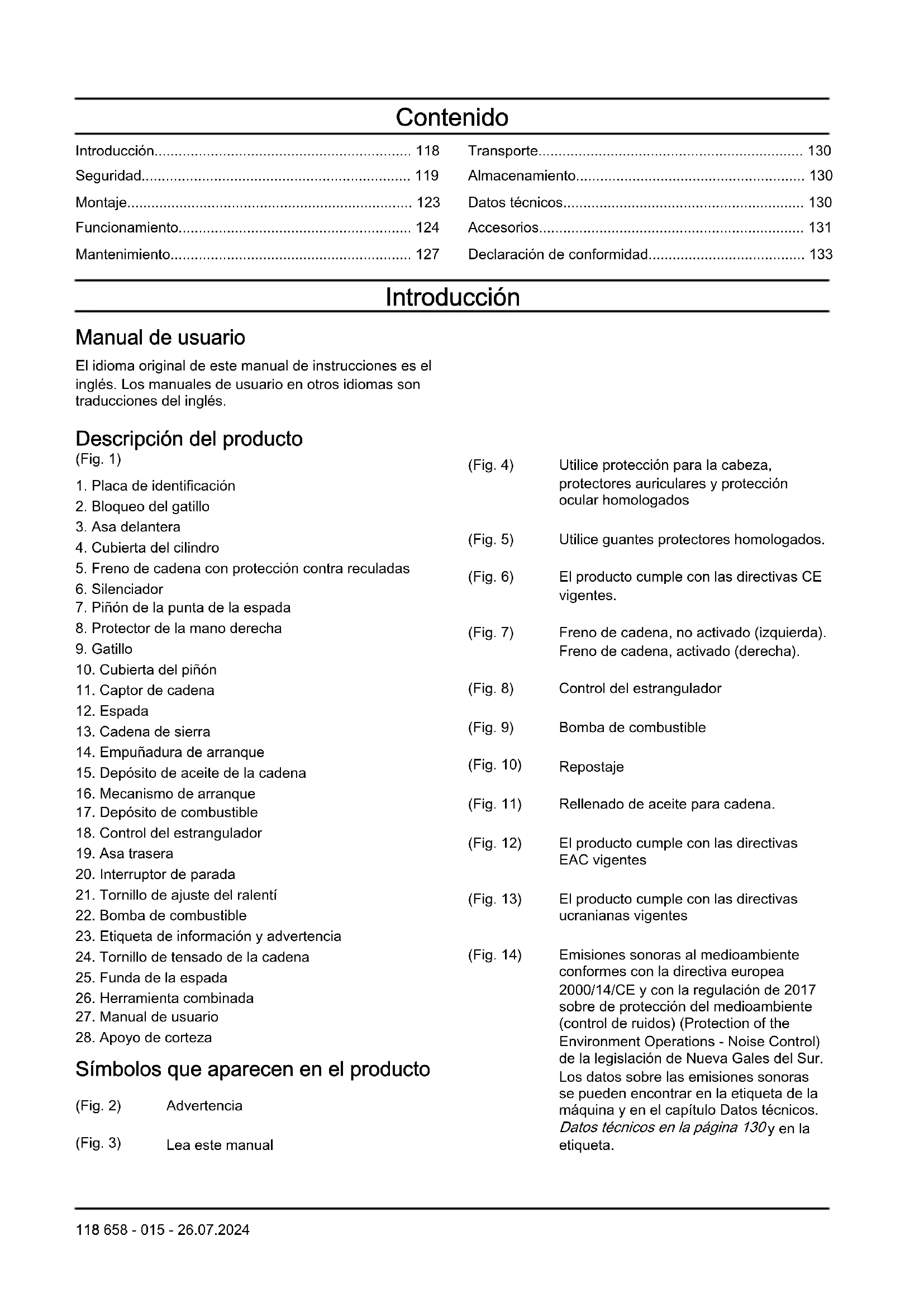 Símbolos que aparecen en el producto (Fig. 2) Advertencia (Fig. 3) Lea este manual (Fig. 4) Utilice protección para la cabeza, protectores auriculares y protección ocular homologados (Fig. 5) Utilice guantes protectores homologados. (Fig. 6) El producto cumple con las directivas CE vigentes. (Fig. 7) Freno de cadena, no activado (izquierda). Freno de cadena, activado (derecha). (Fig. 8) Control del estrangulador (Fig. 9) Bomba de combustible (Fig. 10) Repostaje (Fig. 11) Rellenado de aceite para cadena. (Fig. 12) El producto cumple con las directivas EAC vigentes (Fig. 13) El producto cumple con las directivas ucranianas vigentes (Fig. 14) Emisiones sonoras al medioambiente conformes con la directiva europea 2000/14/CE y con la regulación de 2017 sobre de protección del medioambiente (control de ruidos) (Protection of the Environment Operations - Noise Control) de la legislación de Nueva Gales del Sur. Los datos sobre las emisiones sonoras se pueden encontrar en la etiqueta de la máquina y en el capítulo Datos técnicos. Datos técnicos en la página 130 y en la etiqueta. 118 658 - 015 - 26.07.2024(Fig. 15) Sujete el producto adecuadamente con las dos manos (Fig. 16) No lo utilice con una sola mano (Fig. 17) Evite el contacto con la punta de la espada (Fig. 18) Cuidado con los rebotes (Fig. 19) El producto cumple con las directivas de compatibilidad electromagnética de Australia y Nueva Zelanda vigentes. Nota: Los demás símbolos y etiquetas que aparecen en el producto corresponden a requisitos de homologación específicos en otras zonas comerciales. Fiabilidad del producto Como se estipula en las leyes de responsabilidad del producto, no nos hacemos responsables de los daños y perjuicios causados por nuestro producto si: