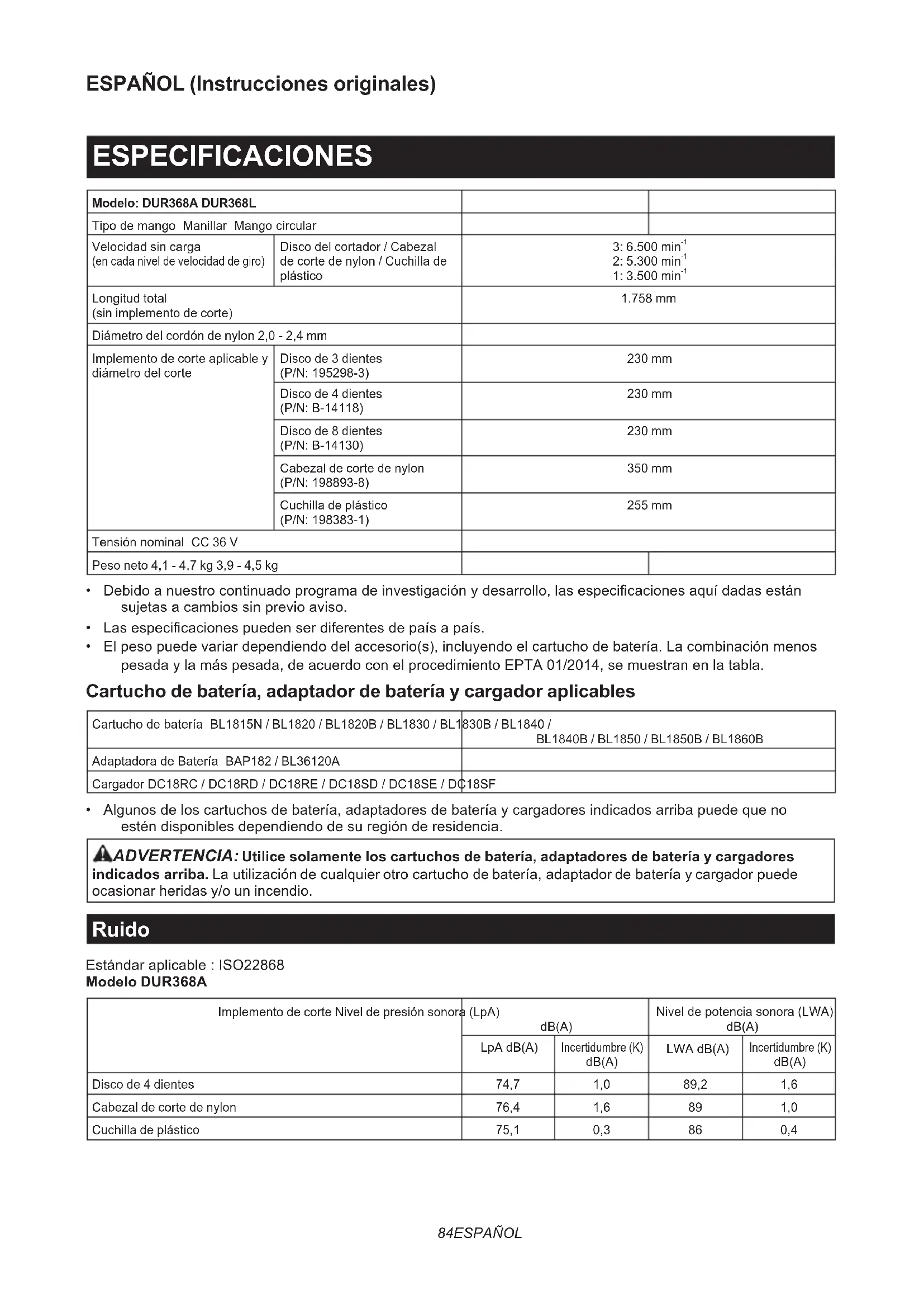 - Algunosdeloscartuchosdebatería,adaptadoresdebateríaycargadoresindicadosarribapuedequeno esténdisponiblesdependiendodesuregiónderesidencia. ADVERTENCIA: Utilice solamente los cartuchos de batería, adaptadores de batería y cargadores indicados arriba.Lautilizacióndecualquierotrocartuchodebatería,adaptadordebateríaycargadorpuede ocasionar heridas y/o un incendio. Ruido Estándaraplicable:ISO22868 Modelo DUR368A Implemento de corte Nivel de presión sonora (LpA)dB(A)Niveldepotenciasonora(LWA)dB(A)LpA dB(A)Incertidumbre (K)dB(A)LWAdB(A)Incertidumbre (K)dB(A) Disco de 4 dientes 74,7 1,0 89,2 1,6 Cabezal de corte de nylon 76,4 1,6 89 1,0 Cuchilla de plástico 75,1 0,3 86 0,485 ESPAÑOL Modelo DUR368L Implemento de corte Nivel de presión sonora (LpA) dB(A) Niveldepotenciasonora(LWA) dB(A) LpA dB(A) Incertidumbre (K) dB(A) LWAdB(A) Incertidumbre (K) dB(A) Disco de 4 dientes 74,7 1,0 89,2 1,6 Cabezal de corte de nylon 76,4 1,6 89 1,0 Cuchilla de plástico 75,1 0,3 86 0,4