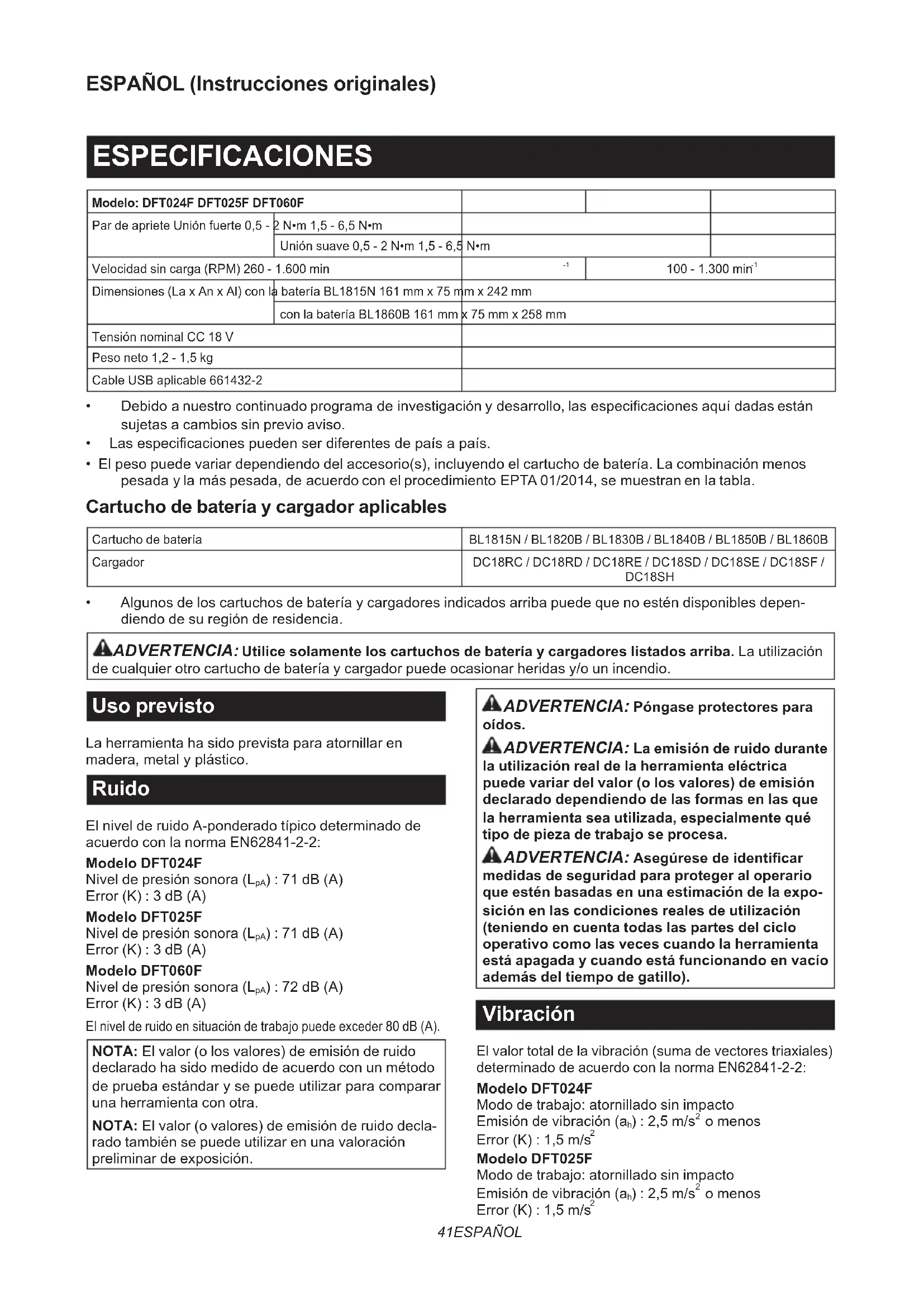 - Batería y cargador genuinos de Makita NOTA:Algunoselementosdelalistapodránestar incluidos en el paquete de la herramienta como acce- soriosestándar.Puedenvariardeunpaísaotro.49 PORTUGUÊS PORTUGUÊS (Instruções originais) ESPECIFICAÇÕES Modelo: DFT024F DFT025F DFT060FBináriodeaperto Junta rígida 0,5 - 2 N•m 1,5 - 6,5 N•mJunta mole 0,5 - 2 N•m 1,5 - 6,5 N•mVelocidade sem carga (RPM) 260 - 1.600 min
