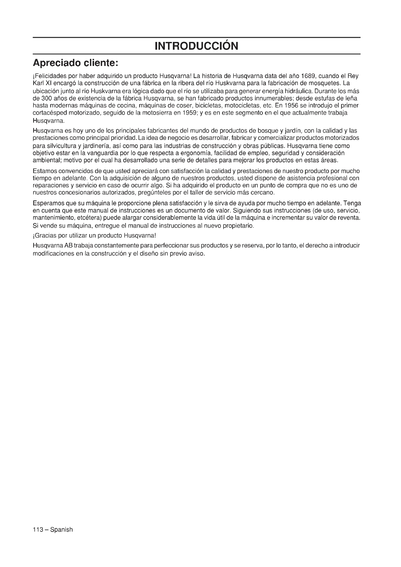 - Afilado y calibres de afilado de la cadena de sierra 146 Declaración CE de conformidad 13 – Spanish INTRODUCCIÓN Apreciado cliente: ¡Felicidades por haber adquirido un producto Husqvarna! La historia de Husqvarna data del año 1689, cuando el Rey Karl XI encargó la construcción de una fábrica en la ribera del río Huskvarna para la fabricación de mosquetes. La ubicación junto al río Huskvarna era lógica dado que el río se utilizaba para generar energía hidráulica. Durante los más de 300 años de existencia de la fábrica Husqvarna, se han fabricado productos innumerables; desde estufas de leña hasta modernas máquinas de cocina, máquinas de coser, bicicletas, motocicletas, etc. En 1956 se introdujo el primer cortacésped motorizado, seguido de la motosierra en 1959; y es en este segmento en el que actualmente trabaja Husqvarna. Husqvarna es hoy uno de los principales fabricantes del mundo de productos de bosque y jardín, con la calidad y las prestaciones como principal prioridad. La idea de negocio es desarrollar, fabricar y comercializar productos motorizados para silvicultura y jardinería, así como para las industrias de construcción y obras públicas. Husqvarna tiene como objetivo estar en la vanguardia por lo que respecta a ergonomía, facilidad de empleo, seguridad y consideración ambiental; motivo por el cual ha desarrollado una serie de detalles para mejorar los productos en estas áreas. Estamos convencidos de que usted apreciará con satisfacción la calidad y prestaciones de nuestro producto por mucho tiempo en adelante. Con la adquisición de alguno de nuestros productos, usted dispone de asistencia profesional con reparaciones y servicio en caso de ocurrir algo. Si ha adquirido el producto en un punto de compra que no es uno de nuestros concesionarios autorizados, pregúnteles por el taller de servicio más cercano. Esperamos que su máquina le proporcione plena satisfacción y le sirva de ayuda por mucho tiempo en adelante. Tenga en cuenta que este manual de instrucciones es un documento de valor. Siguiendo sus instrucciones (de uso, servicio, mantenimiento, etcétera) puede alargar considerablemente la vida útil de la máquina e incrementar su valor de reventa. Si vende su máquina, entregue el manual de instrucciones al nuevo propietario. ¡Gracias por utilizar un producto Husqvarna! Husqvarna AB trabaja constantemente para perfeccionar sus productos y se reserva, por lo tanto, el derecho a introducir modificaciones en la construcción y el diseño sin previo aviso.114 – Spanish ¿QUÉ ES QUÉ? ¿Qué es qué en la motosierra? p. 1461