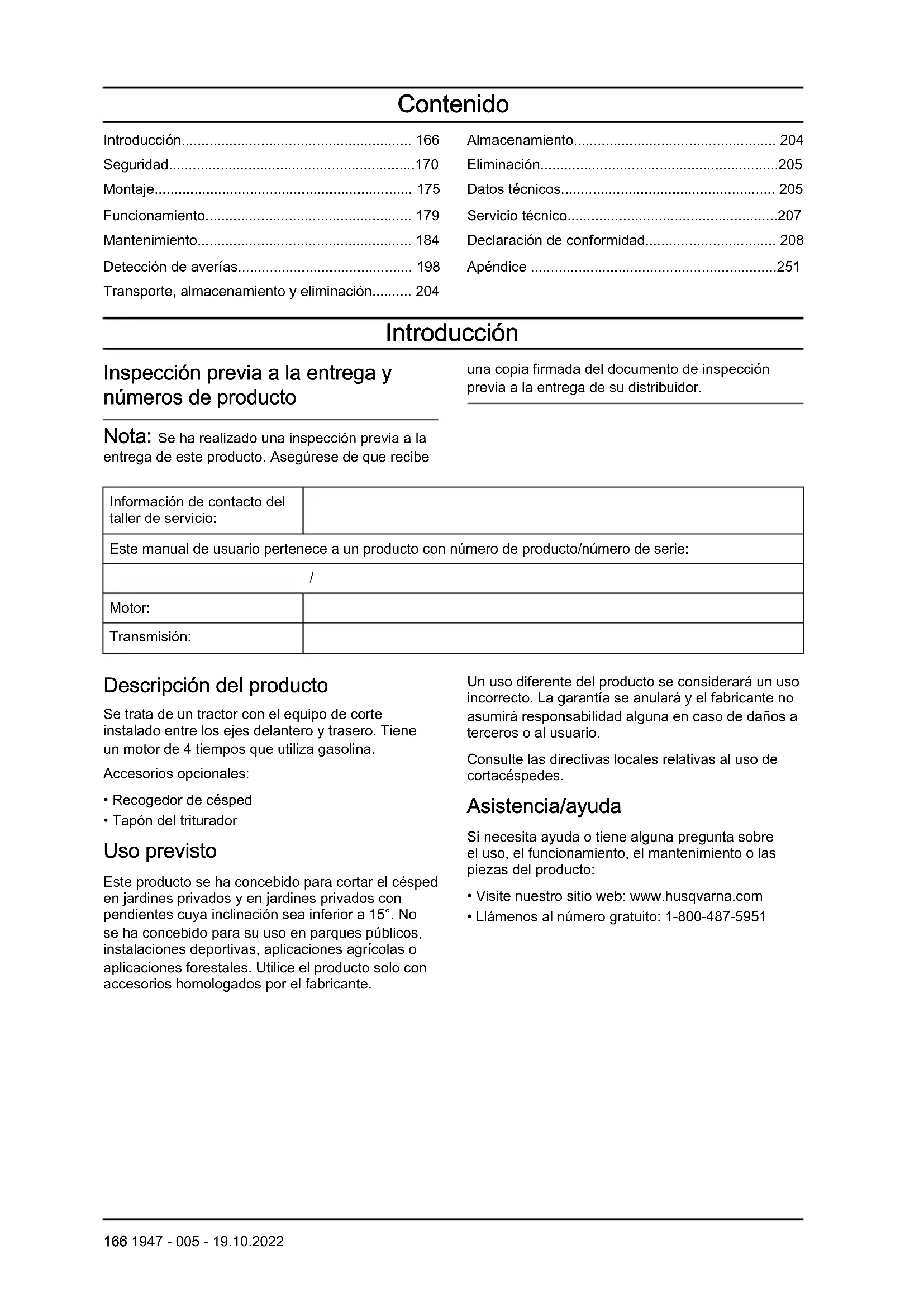 - Tapón del triturador Uso previsto Este producto se ha concebido para cortar el césped en jardines privados y en jardines privados con pendientes cuya inclinación sea inferior a 15°. No se ha concebido para su uso en parques públicos, instalaciones deportivas, aplicaciones agrícolas o aplicaciones forestales. Utilice el producto solo con accesorios homologados por el fabricante. Un uso diferente del producto se considerará un uso incorrecto. La garantía se anulará y el fabricante no asumirá responsabilidad alguna en caso de daños a terceros o al usuario. Consulte las directivas locales relativas al uso de cortacéspedes. Asistencia/ayuda Si necesita ayuda o tiene alguna pregunta sobre el uso, el funcionamiento, el mantenimiento o las piezas del producto: