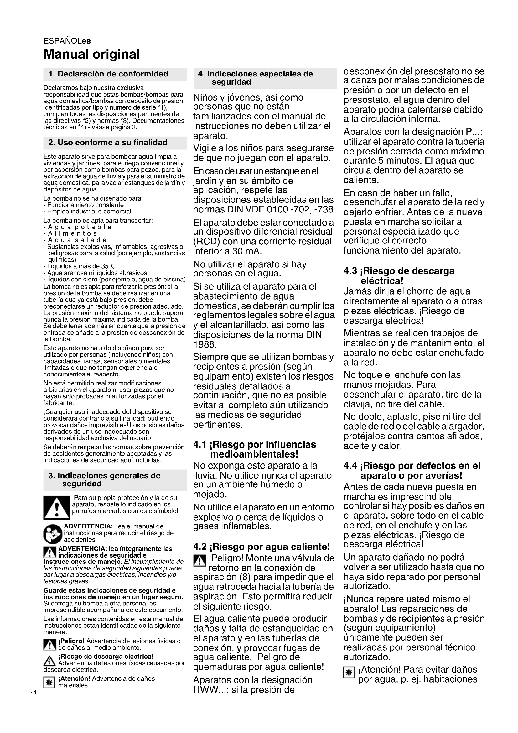 Manual original Declaramos bajo nuestra exclusiva responsabilidad que estas bombas/bombas para agua doméstica/bombas con depósito de presión, identificadas por tipo y número de serie *1), cumplen todas las disposiciones pertinentes de las directivas *2) y normas *3). Documentaciones técnicas en *4) - véase página 3. Este aparato sirve para bombear agua limpia a viviendas y jardines, para el riego convencional y por aspersión como bombas para pozos, para la extracción de agua de lluvia y para el suministro de agua doméstica, para vaciar estanques de jardín y depósitos de agua. La bomba no se ha diseñado para: - Funcionamiento constante - Empleo industrial o comercial La bomba no es apta para transportar: -Agua potable -Alimentos -Agua salada - Sustancias explosivas, inflamables, agresivas o peligrosas para la salud (por ejemplo, sustancias químicas) - Líquidos a más de 35°C - Agua arenosa ni líquidos abrasivos - líquidos con cloro (por ejemplo, agua de piscina) La bomba no es apta para reforzar la presión: si la presión de la bomba se debe realizar en una tubería que ya está bajo presión, debe preconectarse un reductor de presión adecuado. La presión máxima del sistema no puede superar nunca la presión máxima indicada de la bomba. Se debe tener además en cuenta que la presión de entrada se añade a la presión de desconexión de la bomba. Este aparato no ha sido diseñado para ser utilizado por personas (incluyendo niños) con capacidades físicas, sensoriales o mentales limitadas o que no tengan experiencia o conocimientos al respecto. No está permitido realizar modificaciones arbitrarias en el aparato ni usar piezas que no hayan sido probadas ni autorizadas por el fabricante. ¡Cualquier uso inadecuado del dispositivo se considerará contrario a su finalidad; pudiendo provocar daños imprevisibles! Los posibles daños derivados de un uso inadecuado son responsabilidad exclusiva del usuario. Se deberán respetar las normas sobre prevención de accidentes generalmente aceptadas y las indicaciones de seguridad aquí incluidas. ¡Para su propia protección y la de su aparato, respete lo indicado en los párrafos marcados con este símbolo! ADVERTENCIA: Lea el manual de instrucciones para reducir el riesgo de accidentes. ADVERTENCIA: lea íntegramente las indicaciones de seguridad e instrucciones de manejo. El incumplimiento de las instrucciones de seguridad siguientes puede dar lugar a descargas eléctricas, incendios y/o lesiones graves. Guarde estas indicaciones de seguridad e instrucciones de manejo en un lugar seguro. Si entrega su bomba a otra persona, es imprescindible acompañarla de este documento. Las informaciones contenidas en este manual de instrucciones están identificadas de la siguiente manera: ¡Peligro! Advertencia de lesiones físicas o de daños al medio ambiente. ¡Riesgo de descarga eléctrica! Advertencia de lesiones físicas causadas por descarga eléctrica. ¡Atención! Advertencia de daños materiales. Niños y jóvenes, así como personas que no están familiarizados con el manual de instrucciones no deben utilizar el aparato. Vigile a los niños para asegurarse de que no juegan con el aparato. En caso de usar un estanque en el jardín y en su ámbito de aplicación, respete las disposiciones establecidas en las normas DIN VDE 0100 -702, -738. El aparato debe estar conectado a un dispositivo diferencial residual (RCD) con una corriente residual inferior a 30 mA. No utilizar el aparato si hay personas en el agua. Si se utiliza el aparato para el abastecimiento de agua doméstica, se deberán cumplir los reglamentos legales sobre el agua y el alcantarillado, así como las disposiciones de la norma DIN