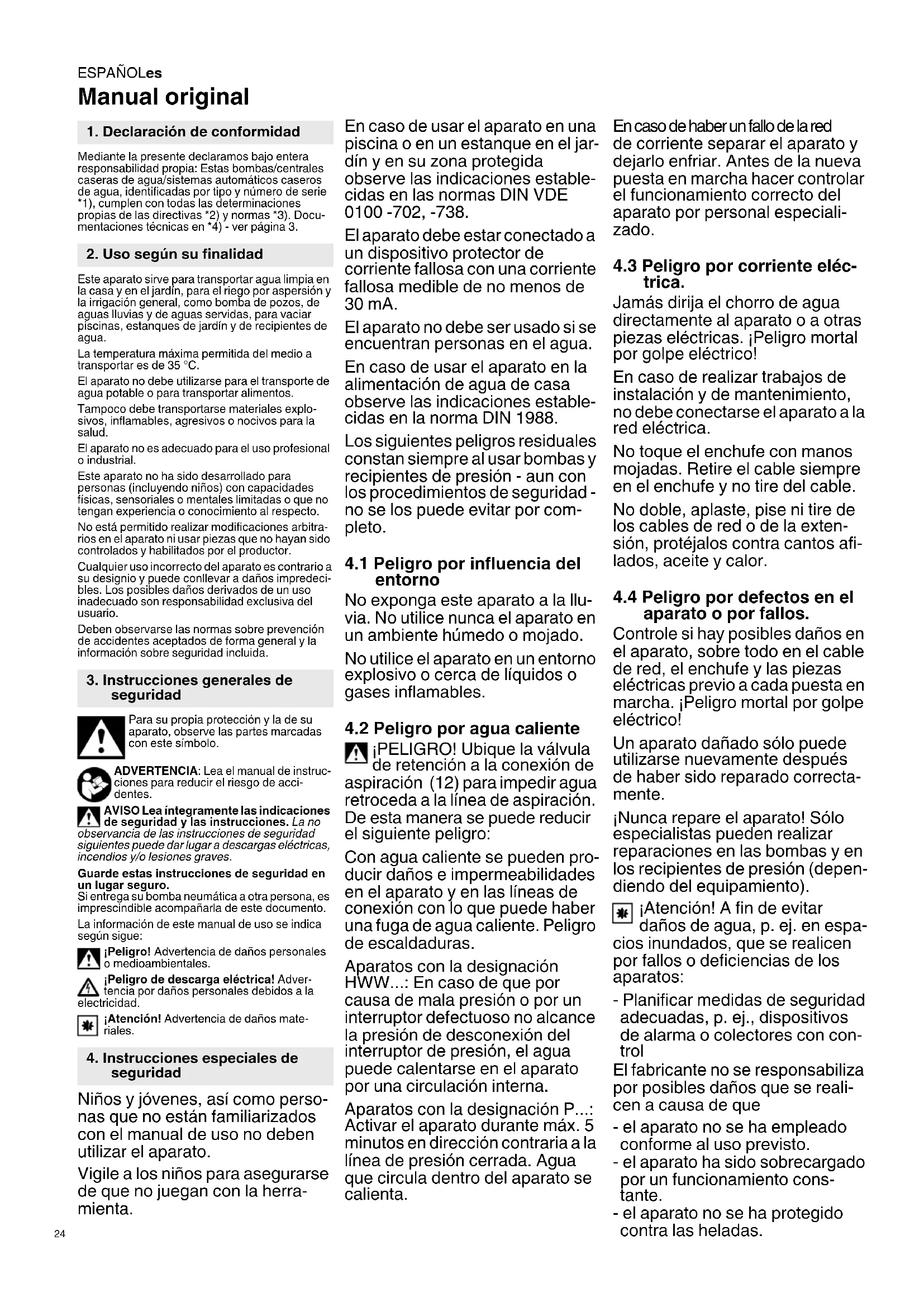 Manual original Mediante la presente declaramos bajo entera responsabilidad propia: Estas bombas/centrales caseras de agua/sistemas automáticos caseros de agua, identificadas por tipo y número de serie *1), cumplen con todas las determinaciones propias de las directivas *2) y normas *3). Docu- mentaciones técnicas en *4) - ver página 3. Este aparato sirve para transportar agua limpia en la casa y en el jardín, para el riego por aspersión y la irrigación general, como bomba de pozos, de aguas lluvias y de aguas servidas, para vaciar piscinas, estanques de jardín y de recipientes de agua. La temperatura máxima permitida del medio a transportar es de 35 °C. El aparato no debe utilizarse para el transporte de agua potable o para transportar alimentos. Tampoco debe transportarse materiales explo- sivos, inflamables, agresivos o nocivos para la salud. El aparato no es adecuado para el uso profesional o industrial. Este aparato no ha sido desarrollado para personas (incluyendo niños) con capacidades físicas, sensoriales o mentales limitadas o que no tengan experiencia o conocimiento al respecto. No está permitido realizar modificaciones arbitra- rios en el aparato ni usar piezas que no hayan sido controlados y habilitados por el productor. Cualquier uso incorrecto del aparato es contrario a su designio y puede conllevar a daños impredeci- bles. Los posibles daños derivados de un uso inadecuado son responsabilidad exclusiva del usuario. Deben observarse las normas sobre prevención de accidentes aceptados de forma general y la información sobre seguridad incluida. Para su propia protección y la de su aparato, observe las partes marcadas con este símbolo. ADVERTENCIA: Lea el manual de instruc- ciones para reducir el riesgo de acci- dentes. AVISO Lea íntegramente las indicaciones de seguridad y las instrucciones. La no observancia de las instrucciones de seguridad siguientes puede dar lugar a descargas eléctricas, incendios y/o lesiones graves. Guarde estas instrucciones de seguridad en un lugar seguro. Si entrega su bomba neumática a otra persona, es imprescindible acompañarla de este documento. La información de este manual de uso se indica según sigue: ¡Peligro! Advertencia de daños personales o medioambientales. ¡Peligro de descarga eléctrica! Adver- tencia por daños personales debidos a la electricidad. ¡Atención! Advertencia de daños mate- riales. Niños y jóvenes, así como perso- nas que no están familiarizados con el manual de uso no deben utilizar el aparato. Vigile a los niños para asegurarse de que no juegan con la herra- mienta. En caso de usar el aparato en una piscina o en un estanque en el jar- dín y en su zona protegida observe las indicaciones estable- cidas en las normas DIN VDE 0100 -702, -738. El aparato debe estar conectado a un dispositivo protector de corriente fallosa con una corriente fallosa medible de no menos de 30 mA. El aparato no debe ser usado si se encuentran personas en el agua. En caso de usar el aparato en la alimentación de agua de casa observe las indicaciones estable- cidas en la norma DIN 1988. Los siguientes peligros residuales constan siempre al usar bombas y recipientes de presión - aun con los procedimientos de seguridad - no se los puede evitar por com- pleto.