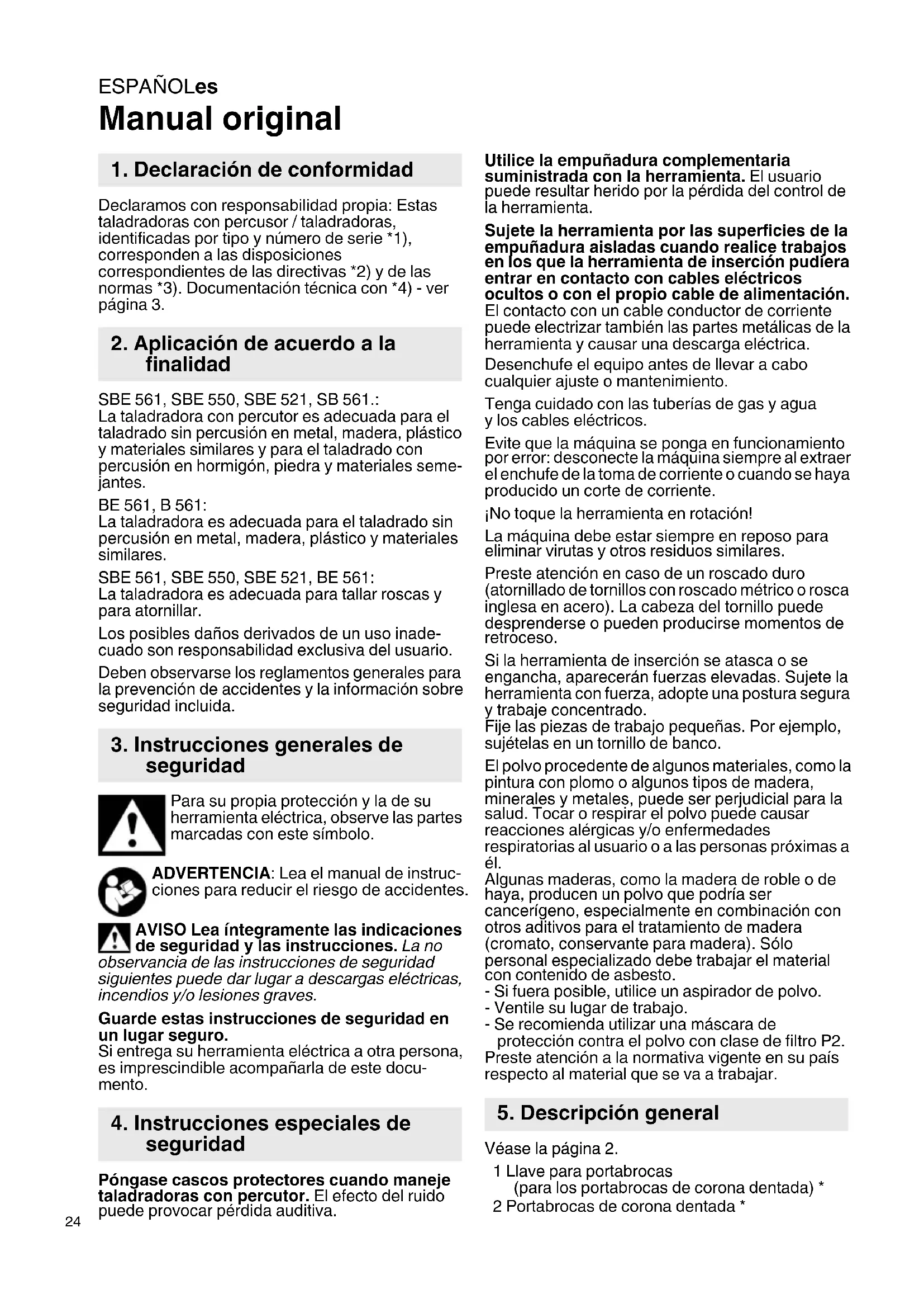 Manual original Declaramos con responsabilidad propia: Estas taladradoras con percusor / taladradoras, identificadas por tipo y número de serie *1), corresponden a las disposiciones correspondientes de las directivas *2) y de las normas *3). Documentación técnica con *4) - ver página 3. SBE 561, SBE 550, SBE 521, SB 561.: La taladradora con percutor es adecuada para el taladrado sin percusión en metal, madera, plástico y materiales similares y para el taladrado con percusión en hormigón, piedra y materiales seme- jantes. BE 561, B 561: La taladradora es adecuada para el taladrado sin percusión en metal, madera, plástico y materiales similares. SBE 561, SBE 550, SBE 521, BE 561: La taladradora es adecuada para tallar roscas y para atornillar. Los posibles daños derivados de un uso inade- cuado son responsabilidad exclusiva del usuario. Deben observarse los reglamentos generales para la prevención de accidentes y la información sobre seguridad incluida. Para su propia protección y la de su herramienta eléctrica, observe las partes marcadas con este símbolo. ADVERTENCIA: Lea el manual de instruc- ciones para reducir el riesgo de accidentes. AVISO Lea íntegramente las indicaciones de seguridad y las instrucciones. La no observancia de las instrucciones de seguridad siguientes puede dar lugar a descargas eléctricas, incendios y/o lesiones graves. Guarde estas instrucciones de seguridad en un lugar seguro. Si entrega su herramienta eléctrica a otra persona, es imprescindible acompañarla de este docu- mento. Póngase cascos protectores cuando maneje taladradoras con percutor. El efecto del ruido puede provocar pérdida auditiva. Utilice la empuñadura complementaria suministrada con la herramienta. El usuario puede resultar herido por la pérdida del control de la herramienta. Sujete la herramienta por las superficies de la empuñadura aisladas cuando realice trabajos en los que la herramienta de inserción pudiera entrar en contacto con cables eléctricos ocultos o con el propio cable de alimentación. El contacto con un cable conductor de corriente puede electrizar también las partes metálicas de la herramienta y causar una descarga eléctrica. Desenchufe el equipo antes de llevar a cabo cualquier ajuste o mantenimiento. Tenga cuidado con las tuberías de gas y agua y los cables eléctricos. Evite que la máquina se ponga en funcionamiento por error: desconecte la máquina siempre al extraer el enchufe de la toma de corriente o cuando se haya producido un corte de corriente. ¡No toque la herramienta en rotación! La máquina debe estar siempre en reposo para eliminar virutas y otros residuos similares. Preste atención en caso de un roscado duro (atornillado de tornillos con roscado métrico o rosca inglesa en acero). La cabeza del tornillo puede desprenderse o pueden producirse momentos de retroceso. Si la herramienta de inserción se atasca o se engancha, aparecerán fuerzas elevadas. Sujete la herramienta con fuerza, adopte una postura segura y trabaje concentrado. Fije las piezas de trabajo pequeñas. Por ejemplo, sujételas en un tornillo de banco. El polvo procedente de algunos materiales, como la pintura con plomo o algunos tipos de madera, minerales y metales, puede ser perjudicial para la salud. Tocar o respirar el polvo puede causar reacciones alérgicas y/o enfermedades respiratorias al usuario o a las personas próximas a él. Algunas maderas, como la madera de roble o de haya, producen un polvo que podría ser cancerígeno, especialmente en combinación con otros aditivos para el tratamiento de madera (cromato, conservante para madera). Sólo personal especializado debe trabajar el material con contenido de asbesto. - Si fuera posible, utilice un aspirador de polvo. - Ventile su lugar de trabajo. - Se recomienda utilizar una máscara de protección contra el polvo con clase de filtro P2. Preste atención a la normativa vigente en su país respecto al material que se va a trabajar. Véase la página 2. 1 Llave para portabrocas (para los portabrocas de corona dentada) * 2 Portabrocas de corona dentada *